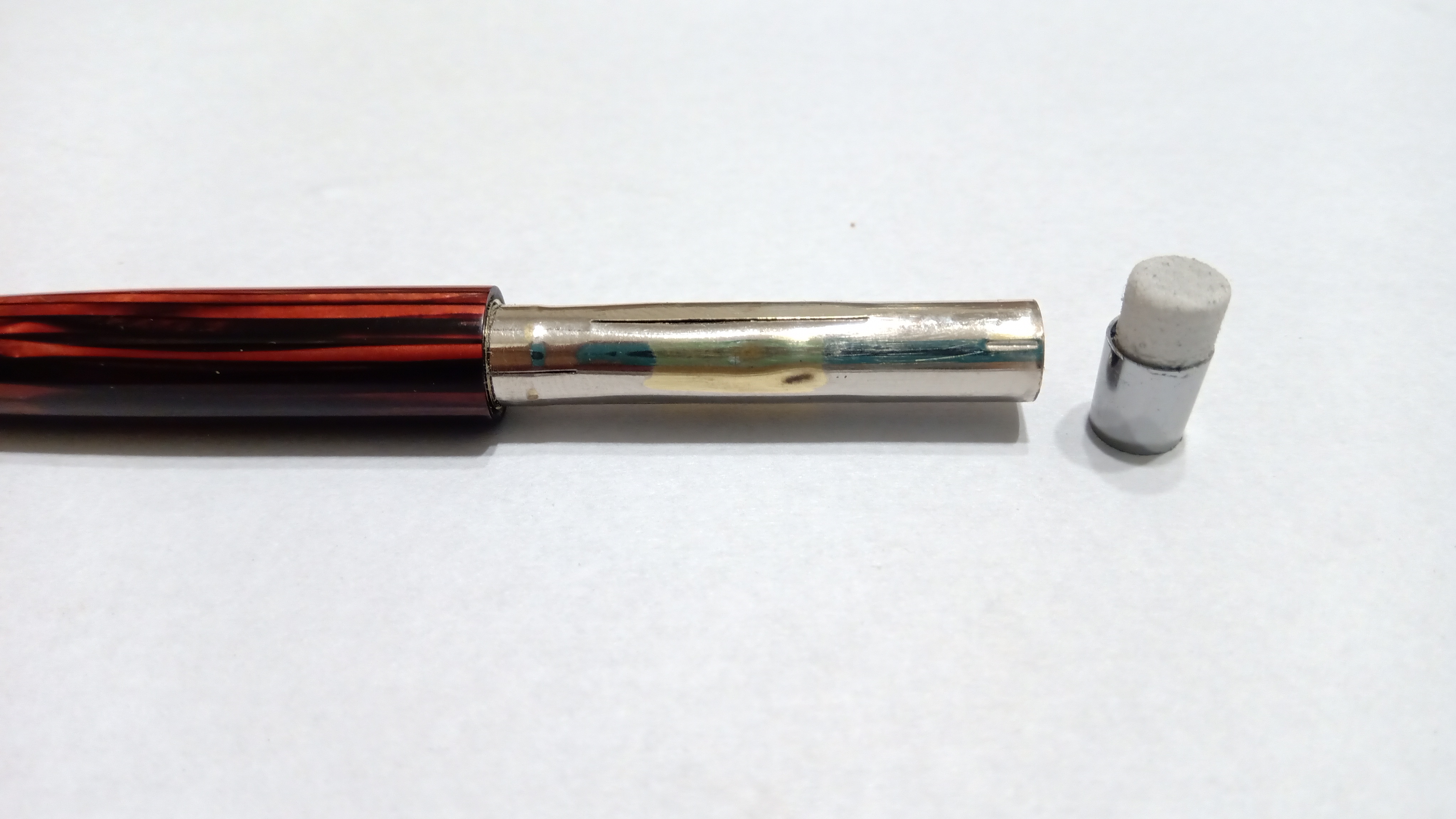 El mecanismo del lápiz estaba trabajando perfectamente, aunque endurecido y con el faltante de la cápsula para alojar la goma de borrar...