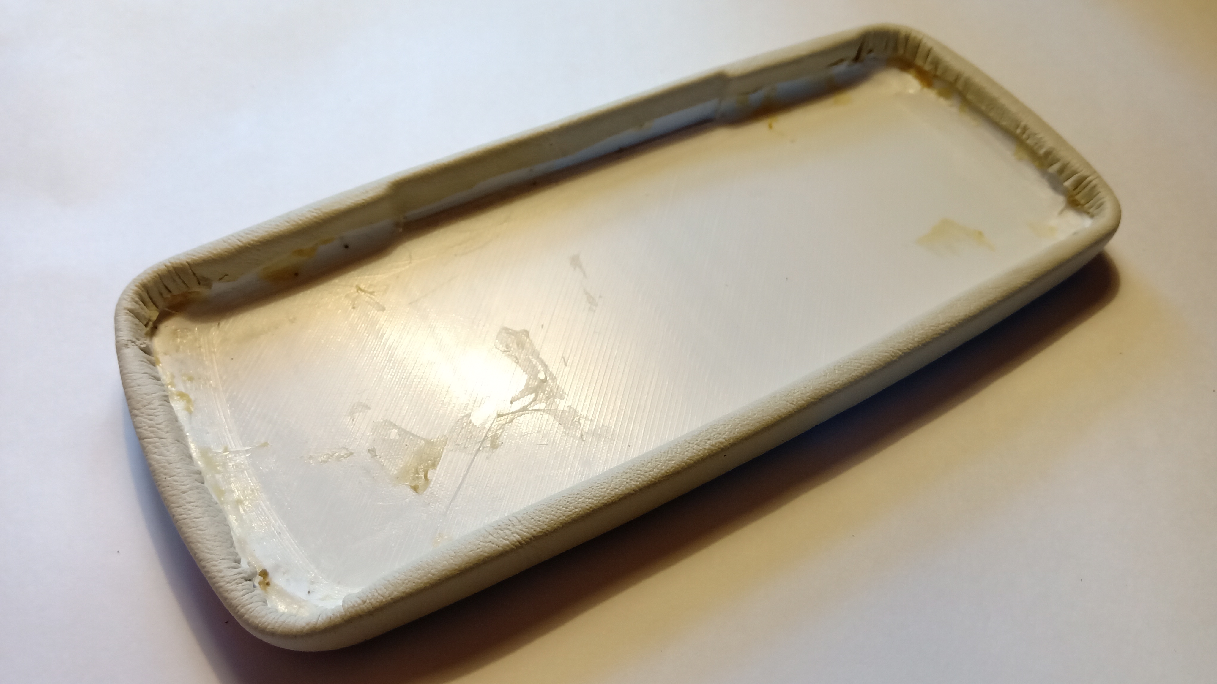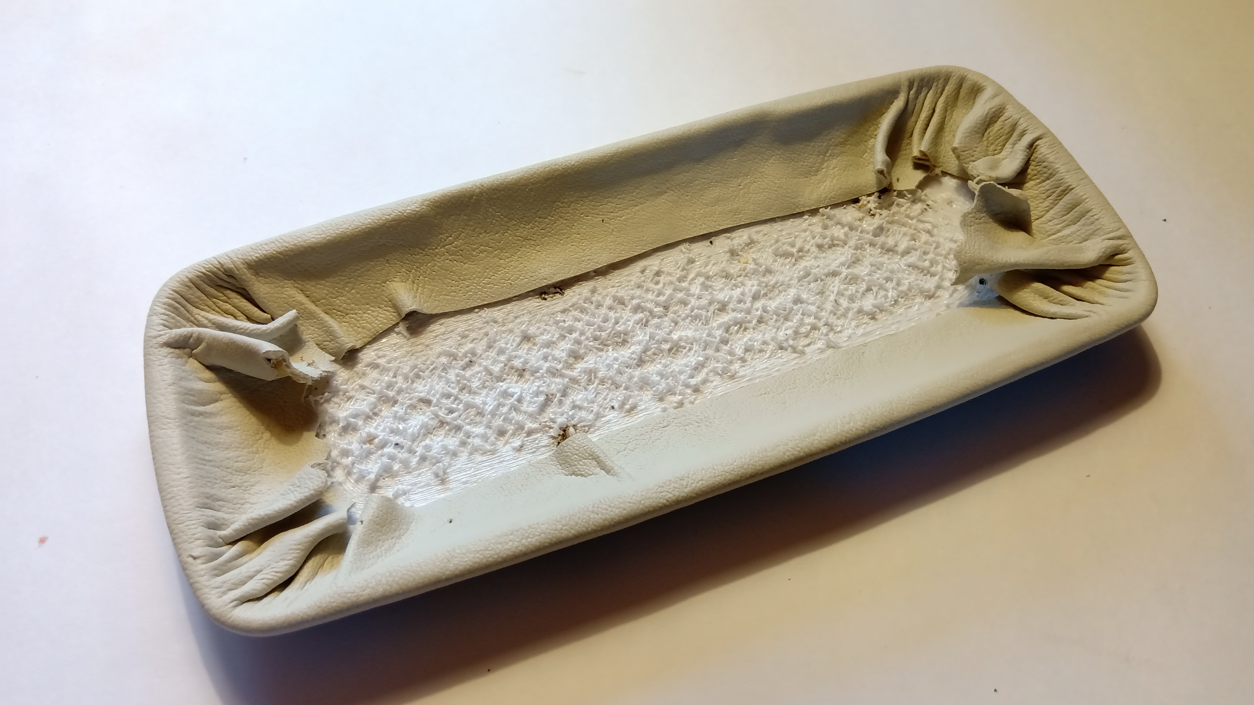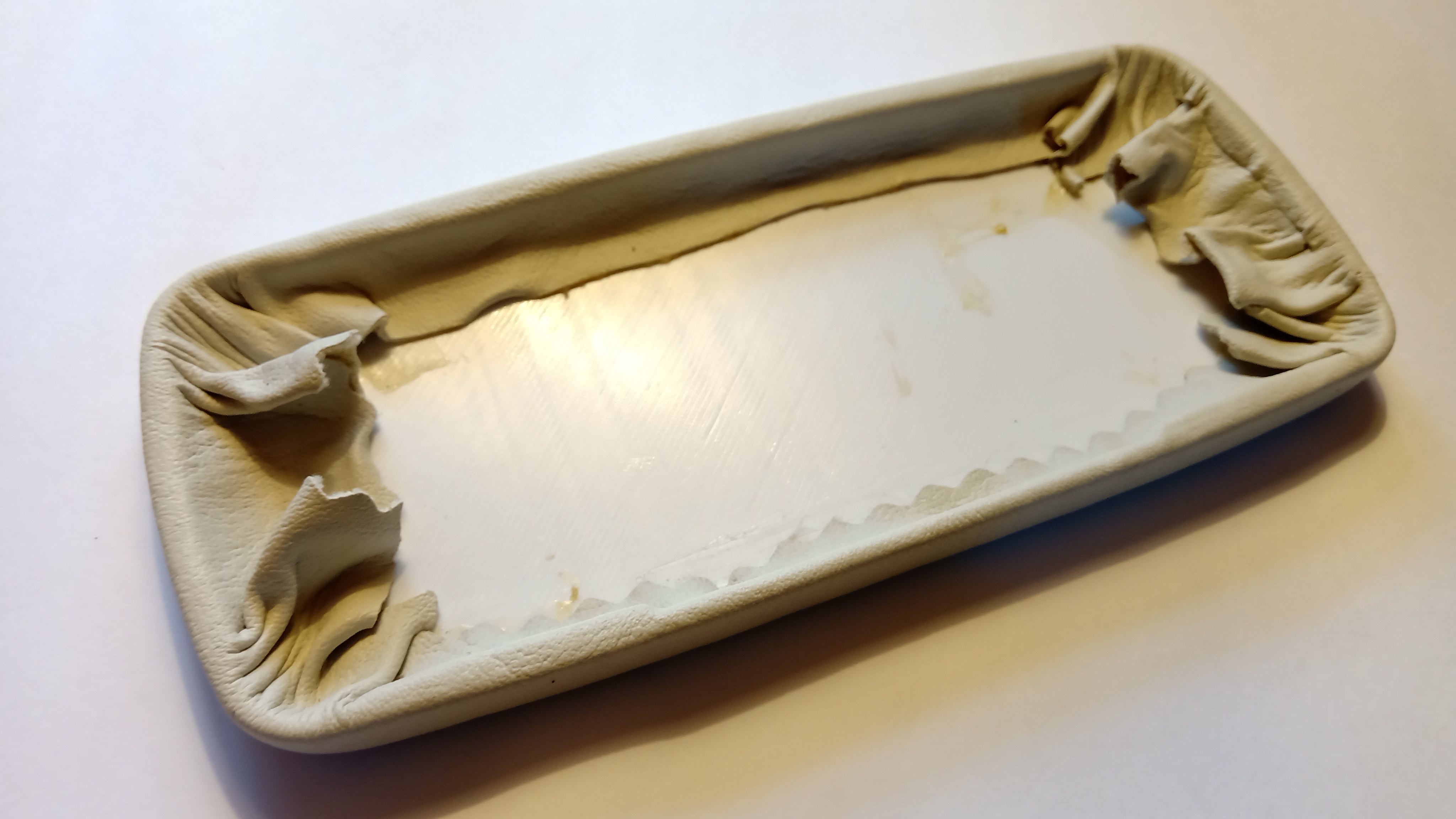 Dopo aver selezionato una pelle sintetica adatta al colore dell'insieme, abbiamo iniziato a rivestire il coperchio e la base utilizzando colla a base di toluene...