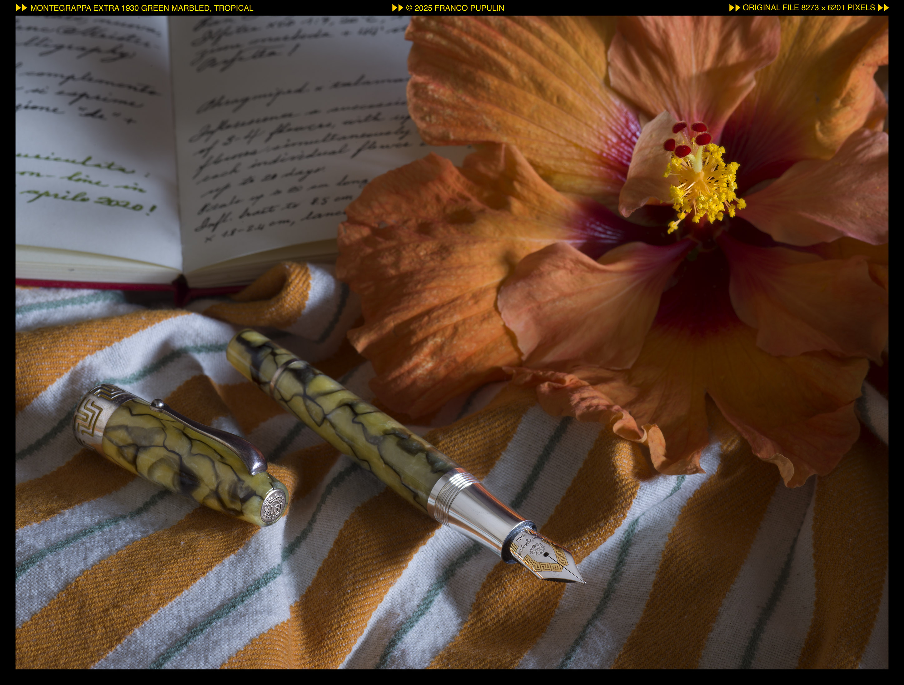 Ve la faccio vedere qui, in una ambientazione tropicale (ora la penna vive con me in Costa Rica), accanto al fiore di una “amapola” (un ibrido del genere Hybiscus). Secondo me, é meravigliosa. Siccome la uso con frequenza, presto inizierà ad avere i suoi segni più scuri, ma sono certo che invecchierà con bellezza, invecchierà meno di quanto lo faccia io, e avrà l’impronta della mia mano. É una cosa che mi rende felice e mi commuove.