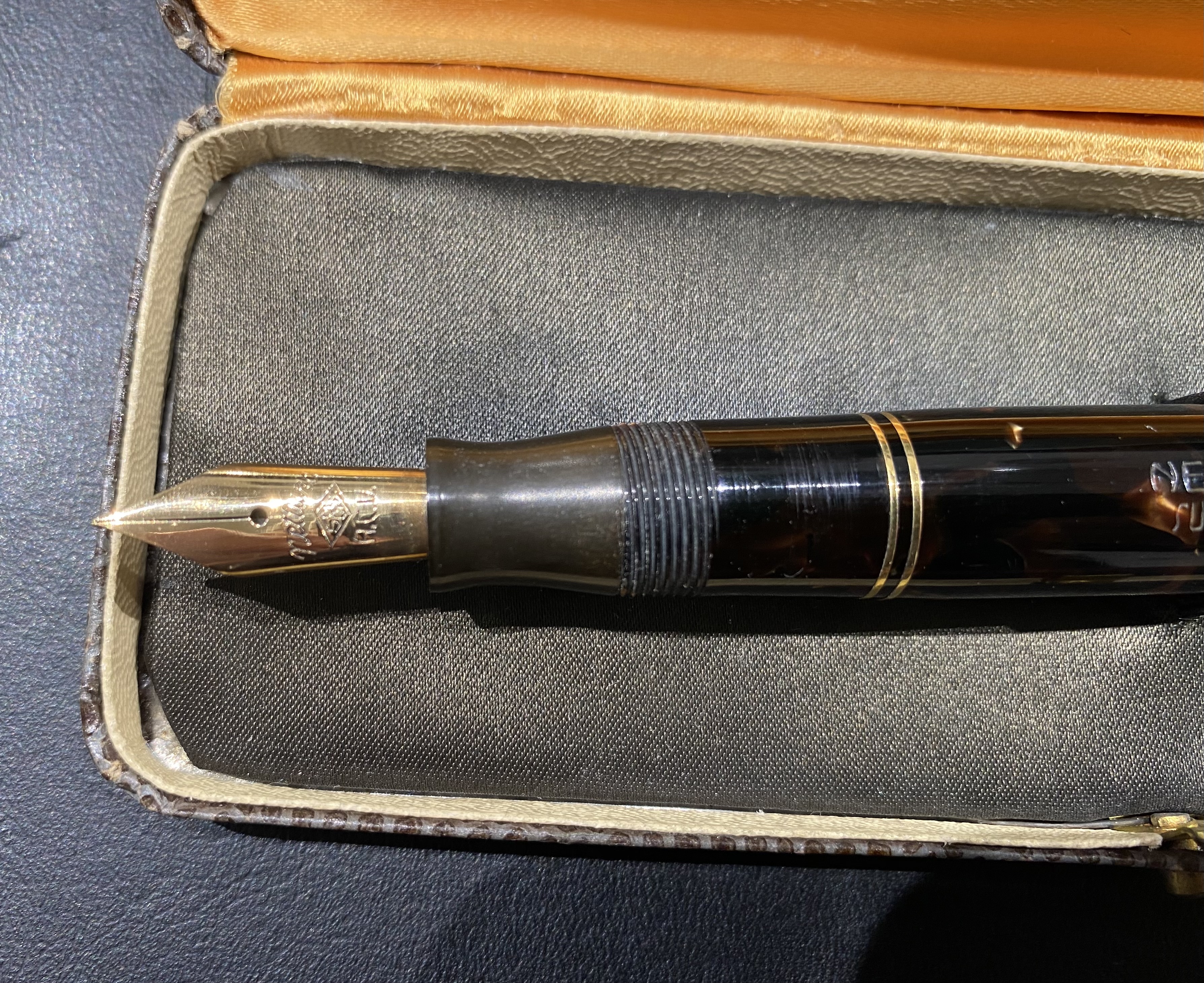 Parliamo di un pezzo davvero raro, realizzato in una magnifica celluloide marrone. Ciò che lo rende speciale non è solo la sua tonalità calda e ricca di sfumature, ma anche il sorprendente stato di conservazione, che si avvicina a quello di un New Old Stock mai utilizzato.