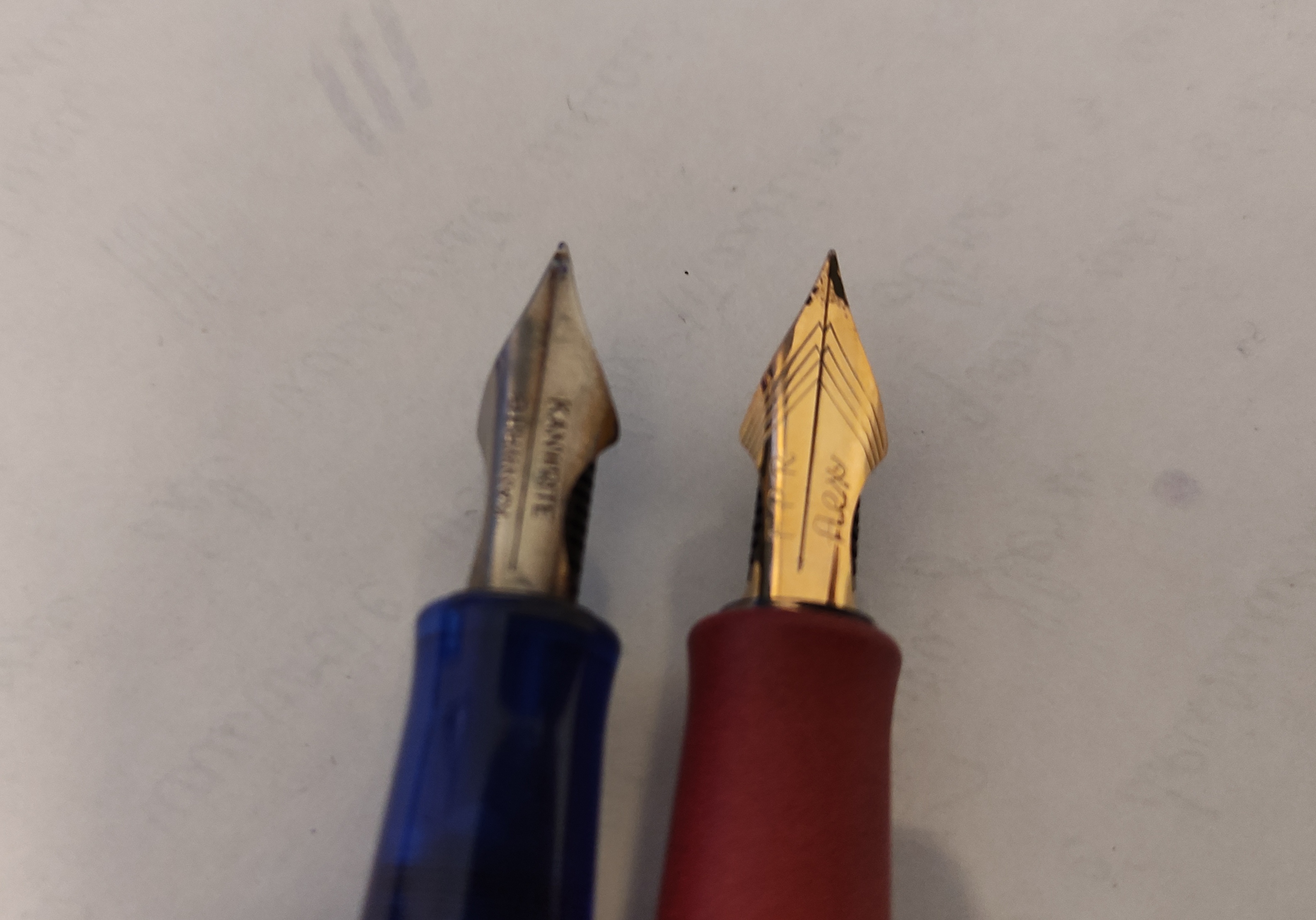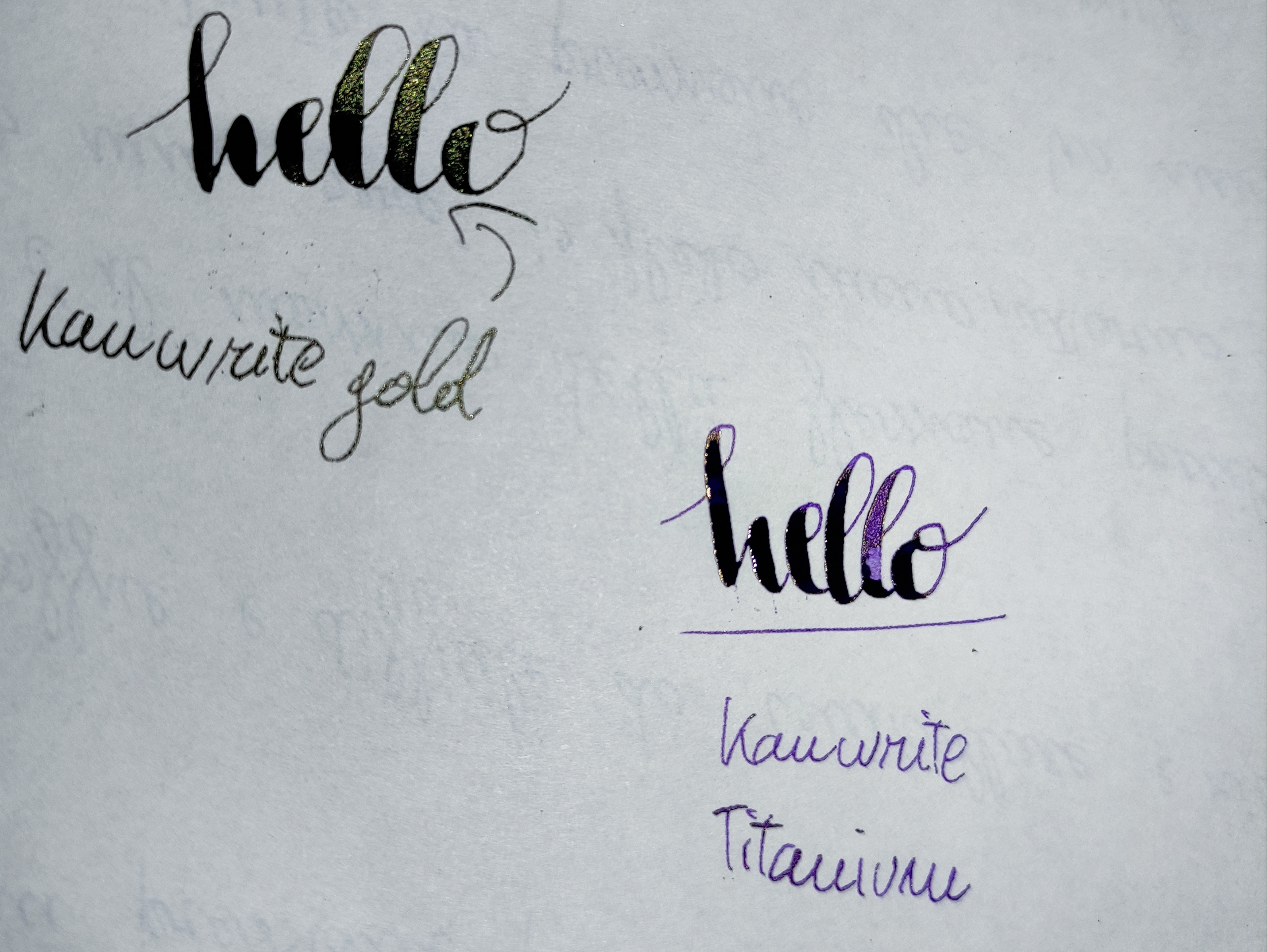 Tutti i pennini hanno una punta diversa. Kanwrite titanio e oro hanno una punta più grossa e kanwrite titanio nello specifico ha una punta saldata sul centro invece oro salda la punta sotto il dorso del pennino. Se avessi un apparecchio fotografico per dimostrarlo avrei già fatto foto.