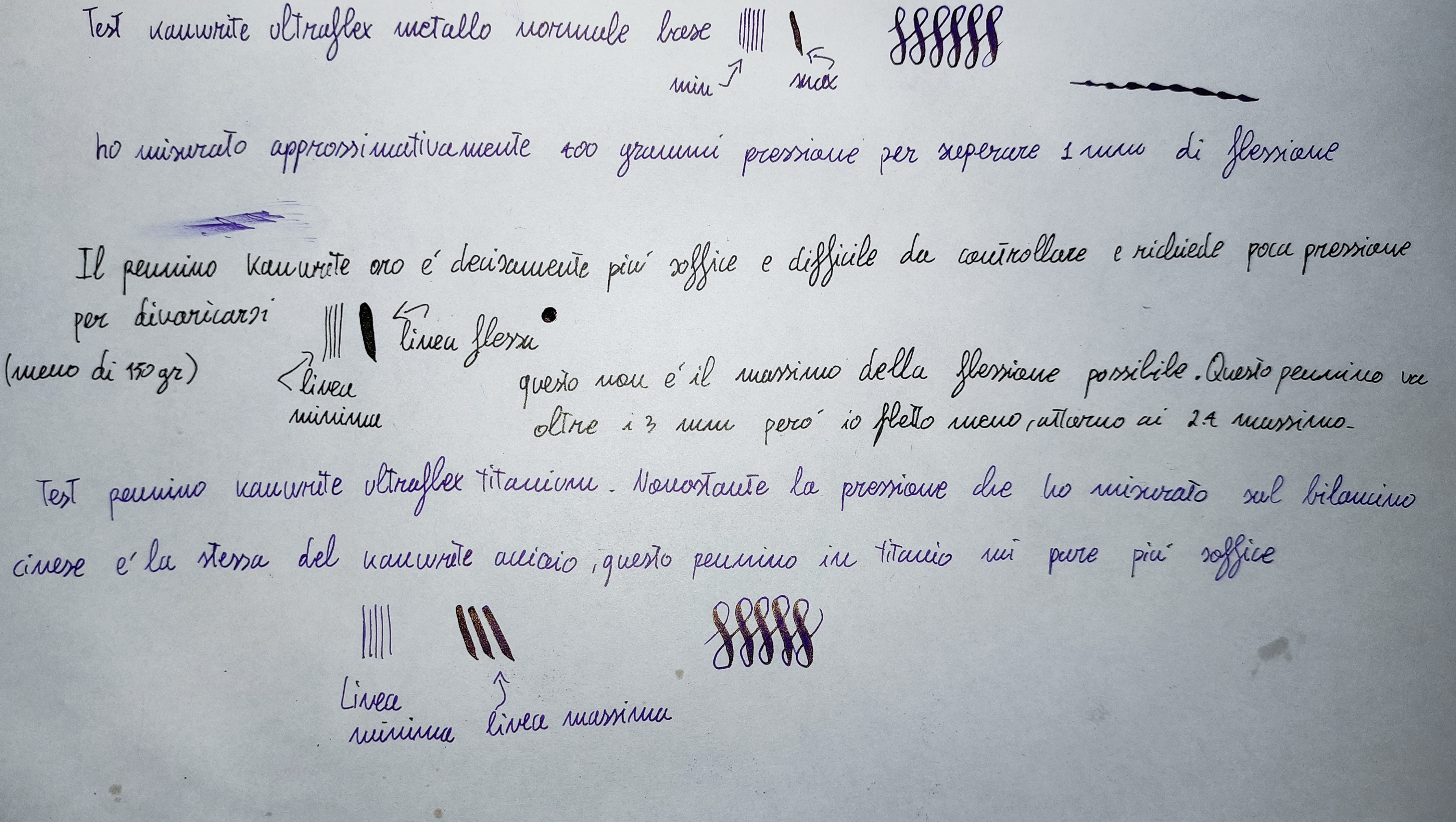 Titanio e acciaio offrono un comportamento simile con differenze più sensoriali che meccaniche, mentre l’oro è decisamente più soffice. Una cosa che posso dire riguardo tutti questi pennini kanwrite è che sono difficili da settare sull'alimentatore. Le foto che posto non rappresentano la flessione massima di questi pennini, si tratta del livello di pressione che io mi sento confidente a produrre. Kanwrite acciaio fa 2.1 massimo, titanio 2.2, oro 3mm. Però io rimango ben sotto questo limite non mi sento confidente a spingere oltre.