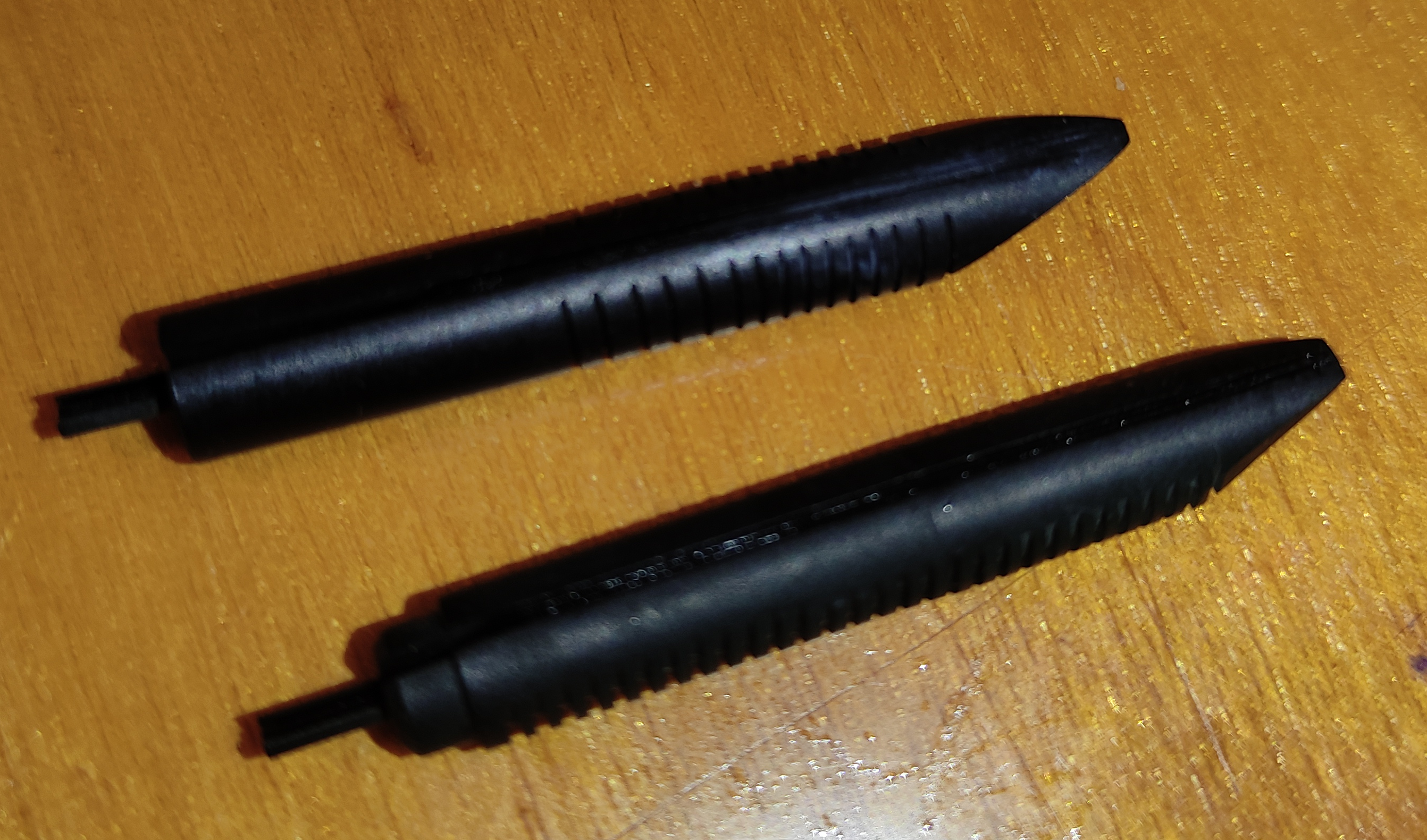 Titanio & Oro: rebbi sono più tesi e nelle linee rapide il tratto può interrompersi se non si applica pressione costante. Questo li rende più adatti a una scrittura lenta, calligrafica, piuttosto che "di getto". Io personalmente ho risolto il problema stampando un collare che preme di più, ma di default questo è ciò che offre kanwrite e quindi se comperate oro o titanio probabilmente li troverete un minimo troppo tesi.