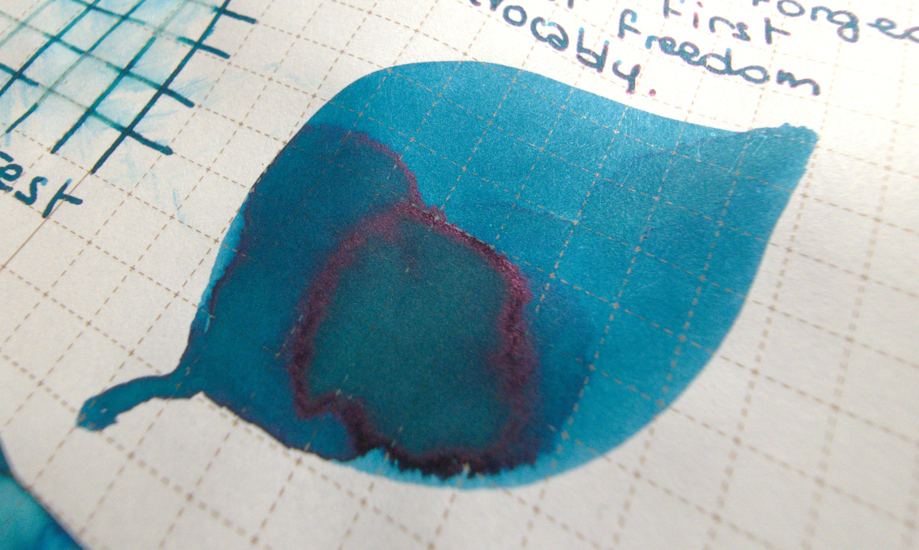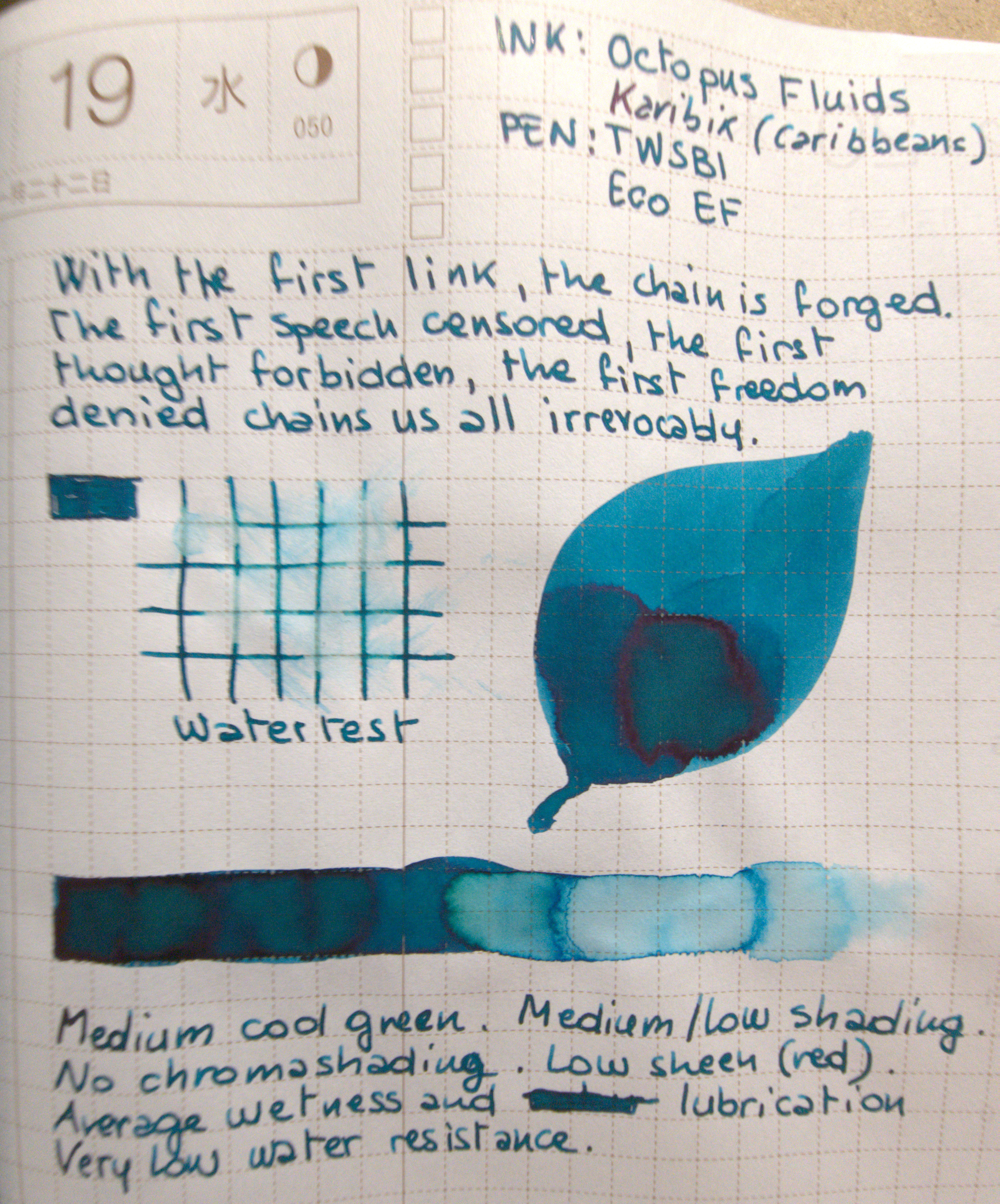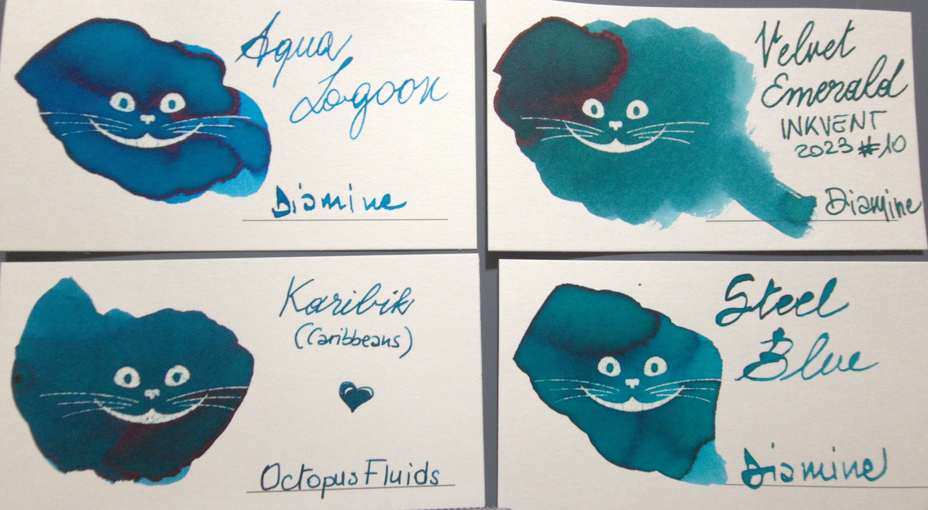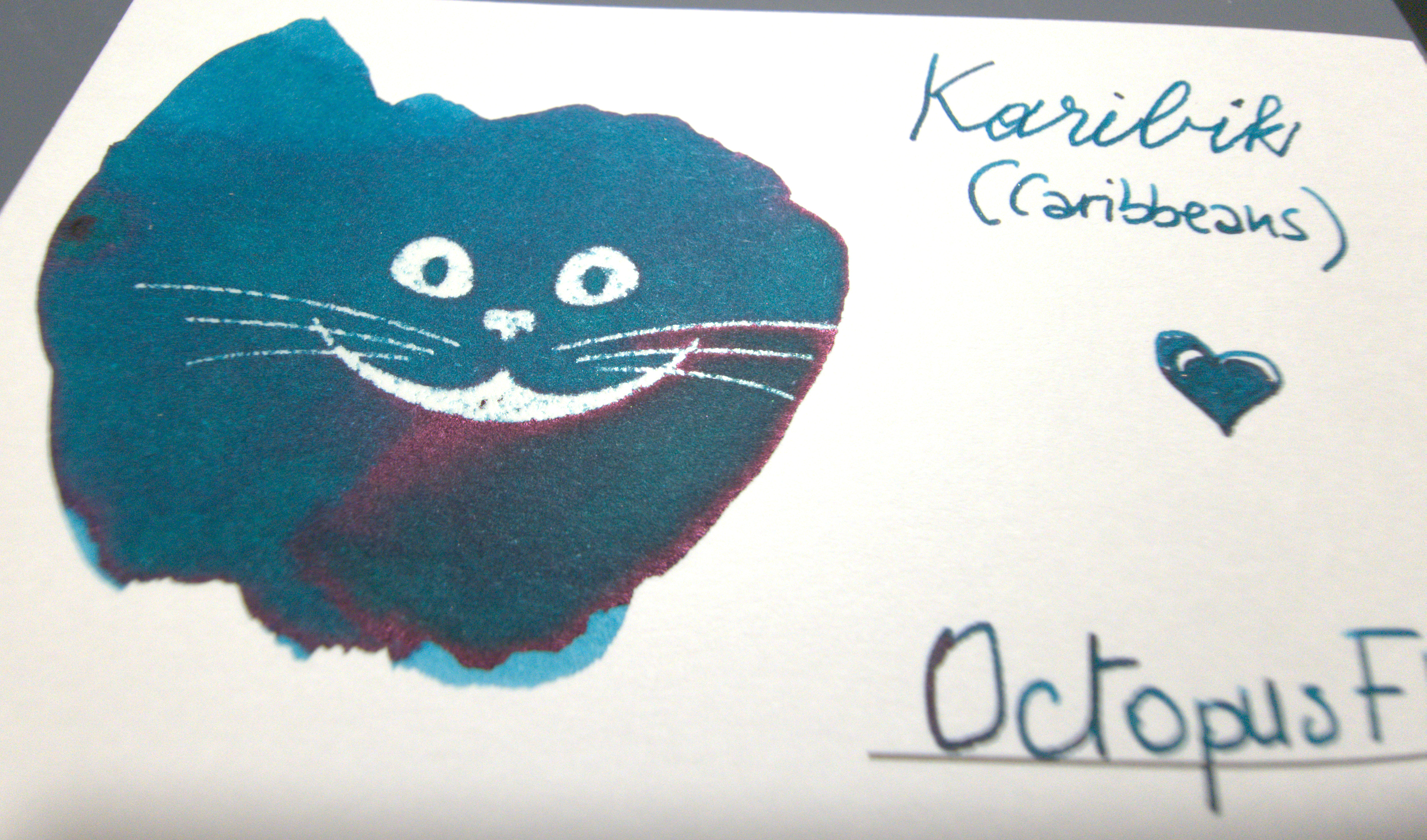 Non ho quasi nulla che posso essere confrontato con Karibik. Trovo interessante, però, che sembri quasi il figlio dell'amore tra Aqua Lagoon e Steel Blue di Diamine, cromaticamente.
