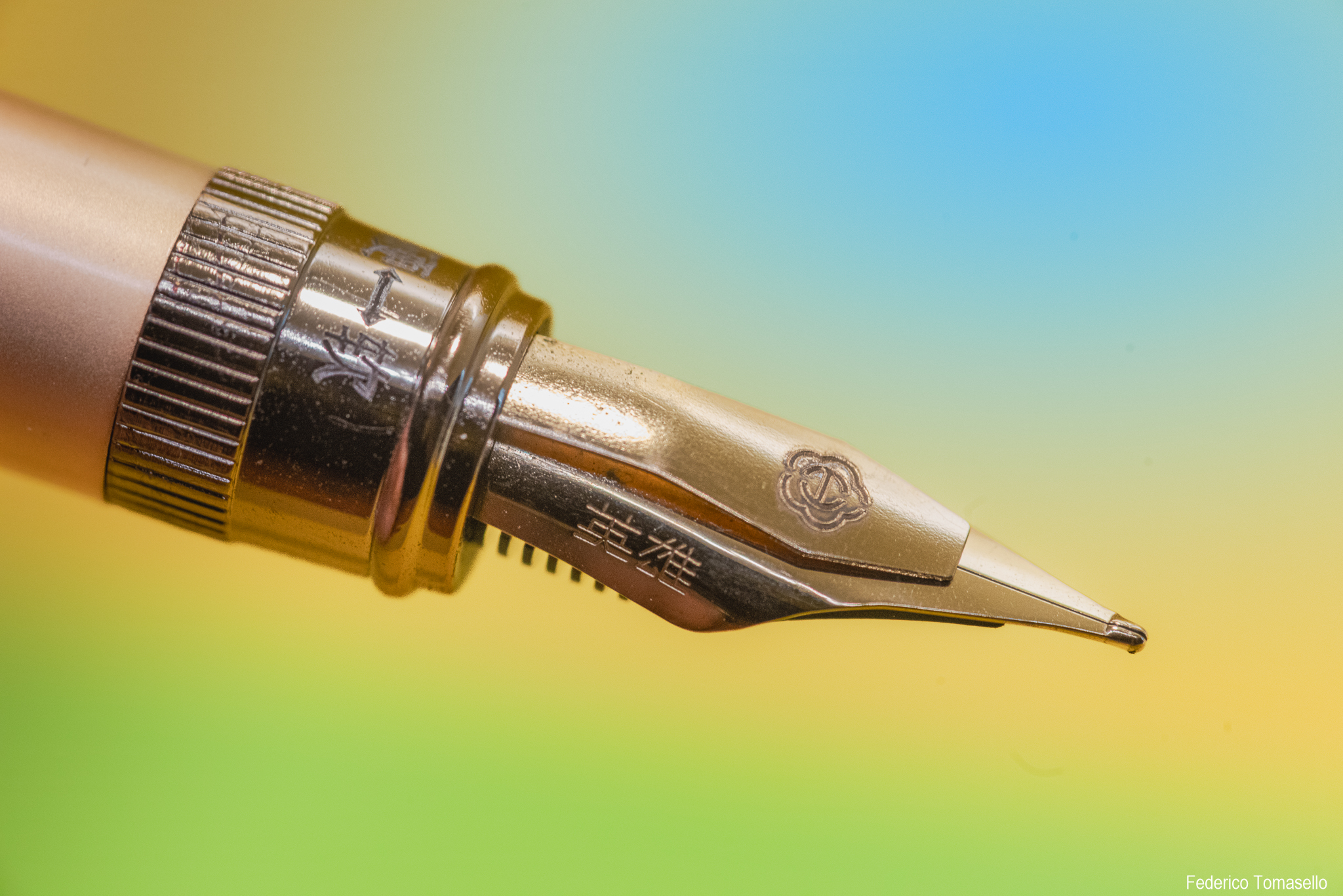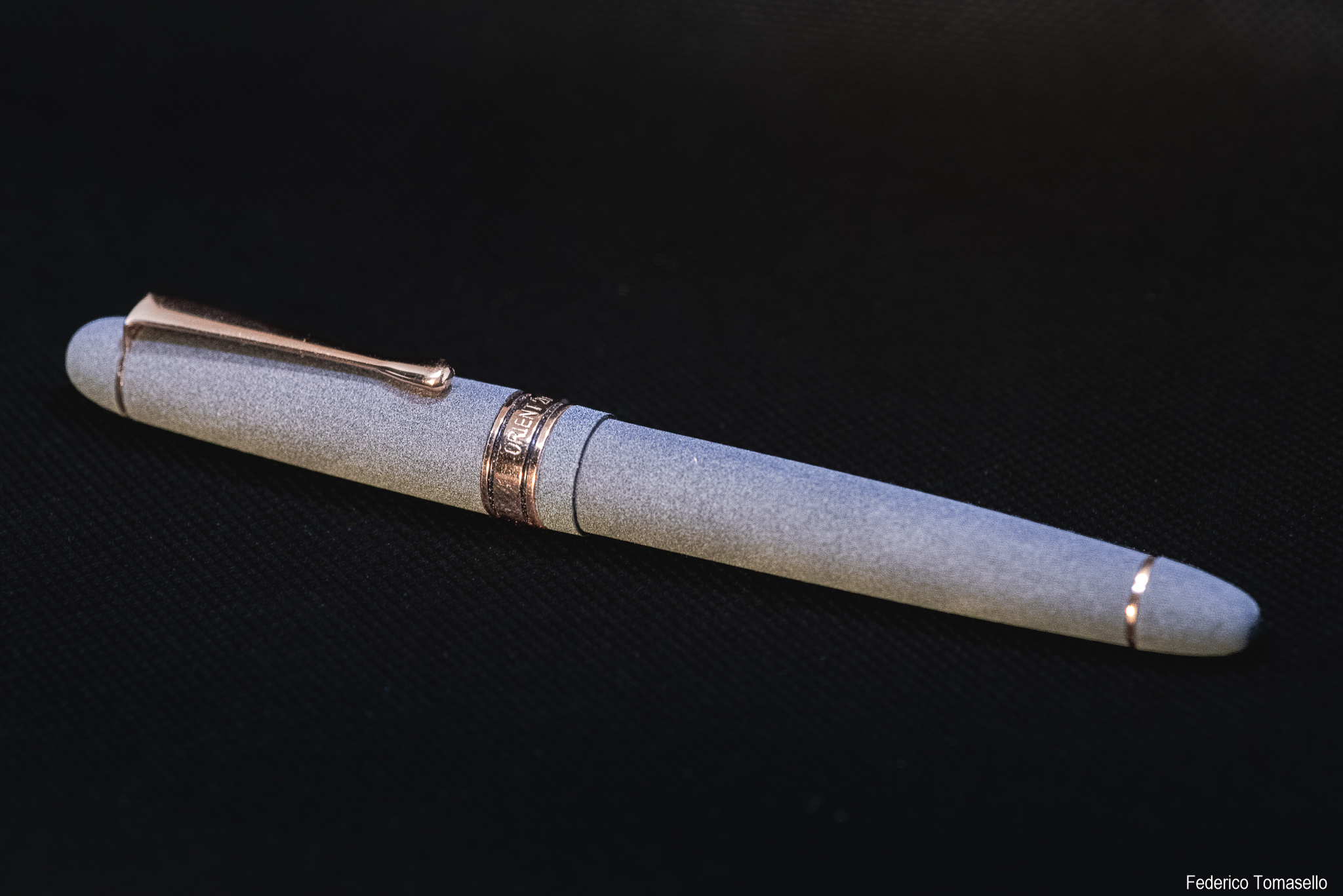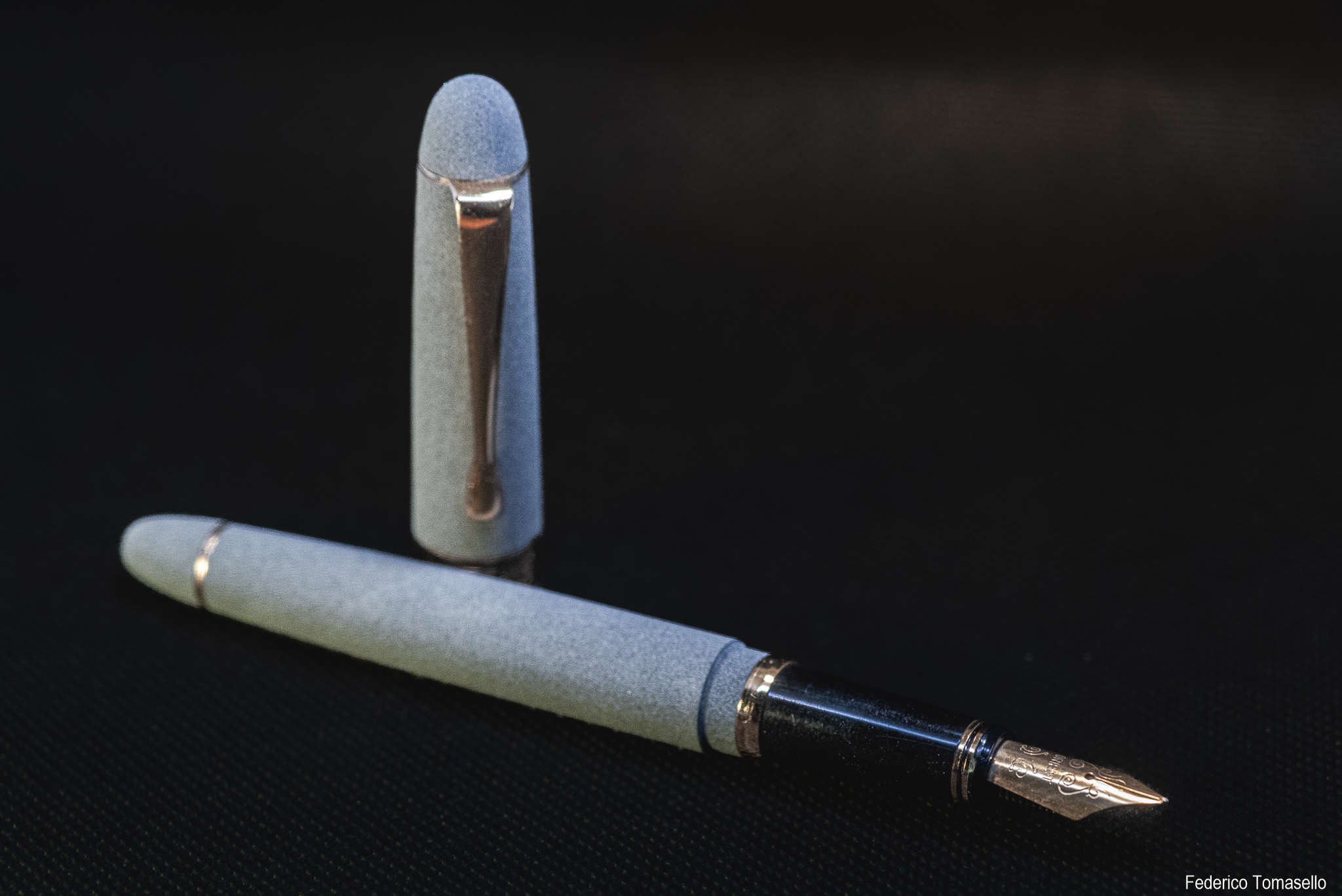 Intanto questa A9 mi è sembrata molto carina, con una livrea particolare e una finitura finemente sabbiata molto piacevole sulle dita. Come sempre il pennino scrive bene e senza intoppi (anche se in partenza aveva i rebbi leggermente disassati), con un flusso molto abbondante e un tratto fine di tipo europeo.