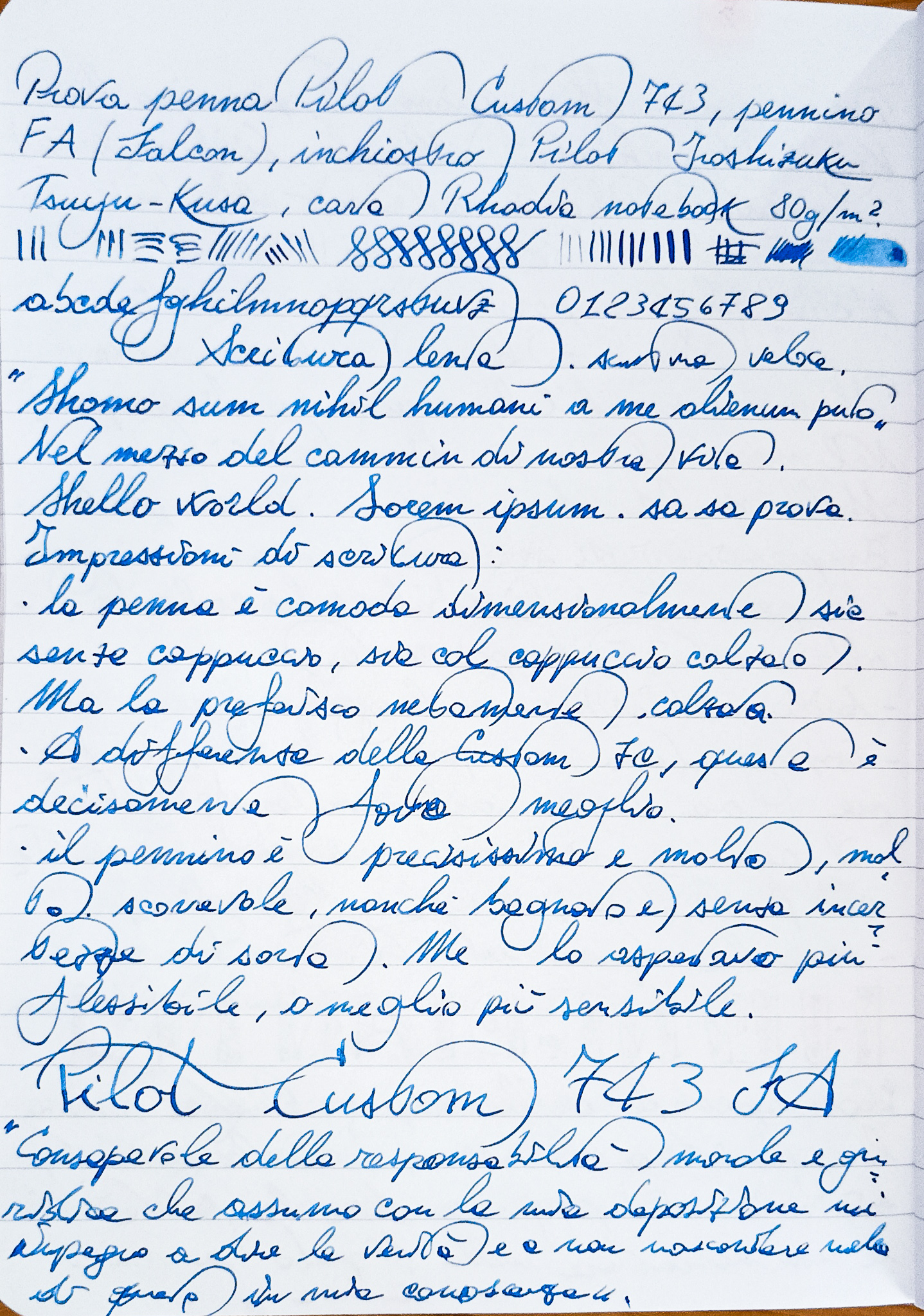 Pur brutta uguale (no dai... poco meno), devo ammettere le che la 743 è di tutt'altra pasta rispetto alla 74: questa sembra fatta bene, ha un suo peso, una sua impugnabilità e gareggia tranquillamente con le penne cinesi da 30€, non solo con quelle da 3€; il pennino, così come già l'SFM della 74, non mi ha dato nessun problema di utilizzo, mi è piaciuto fin da subito ed è anche migliorato con l'uso.