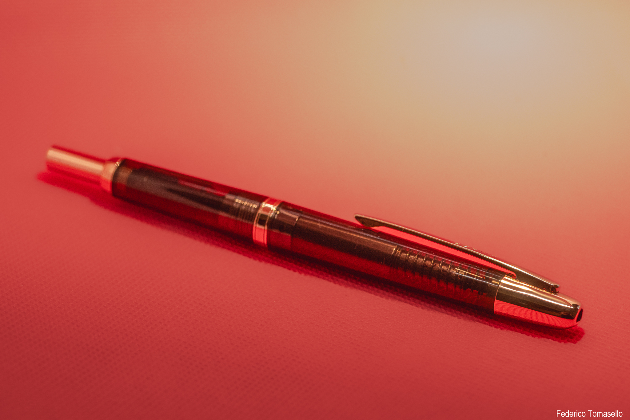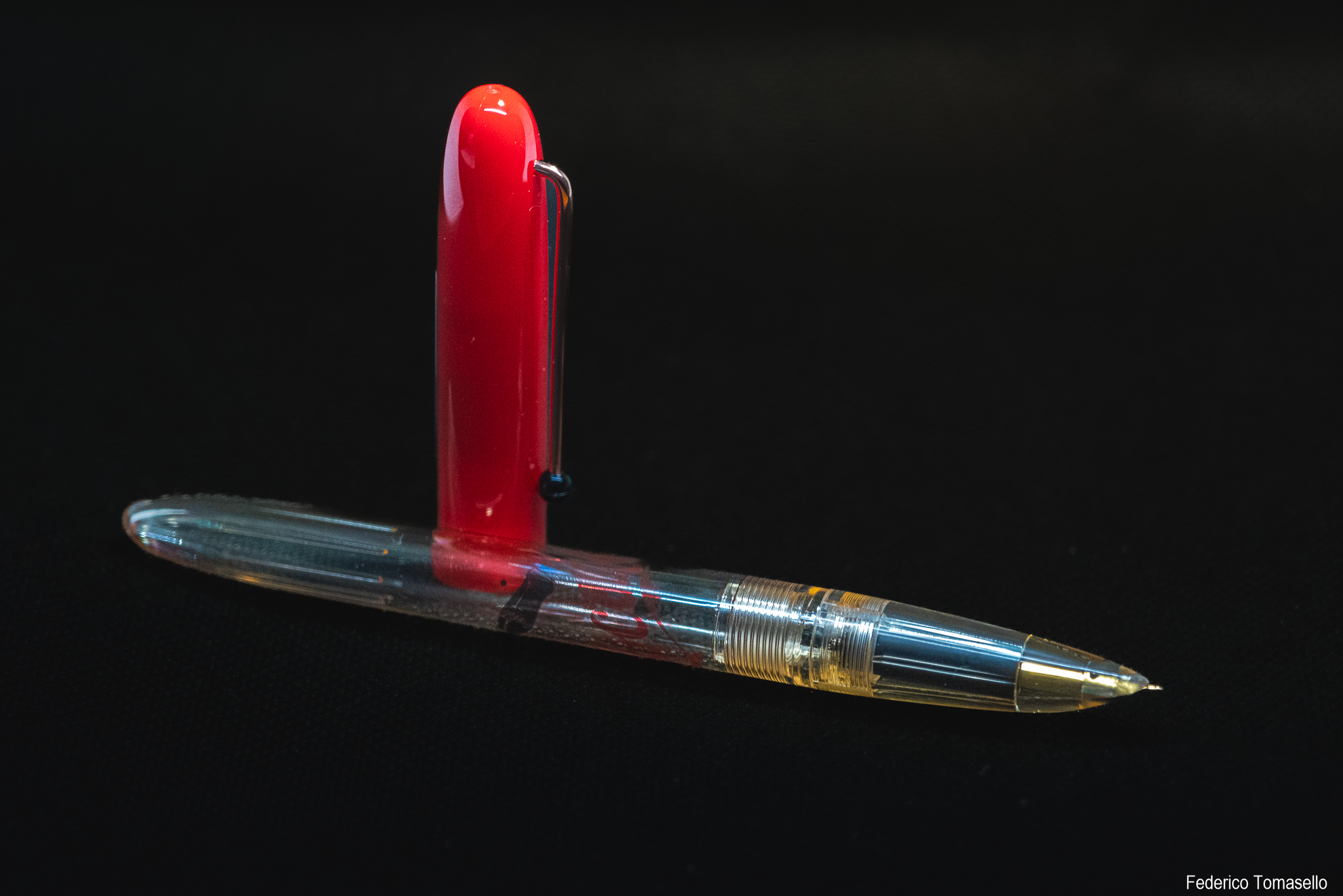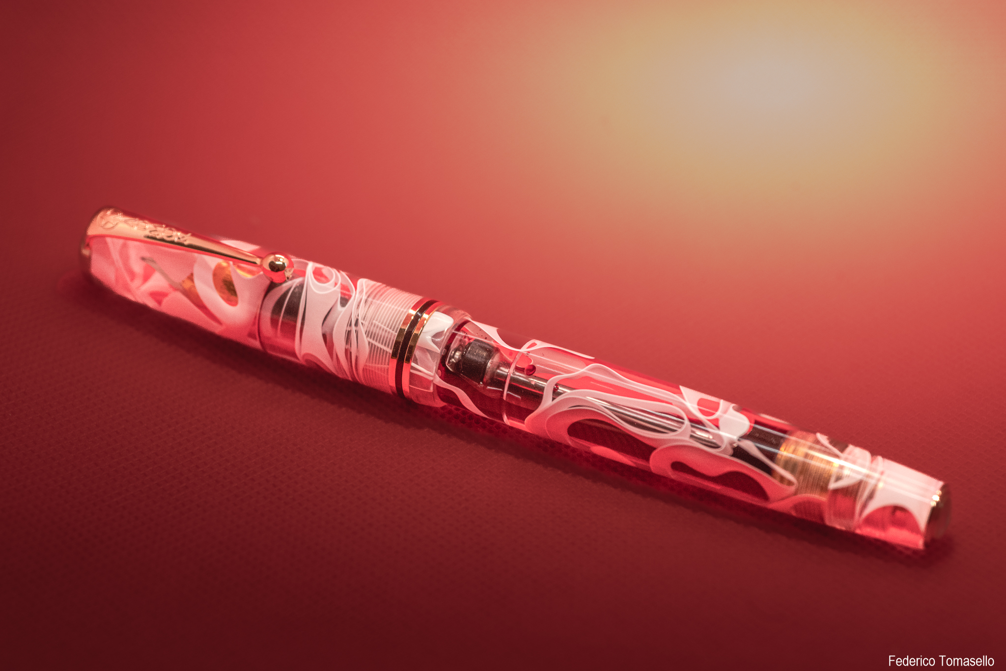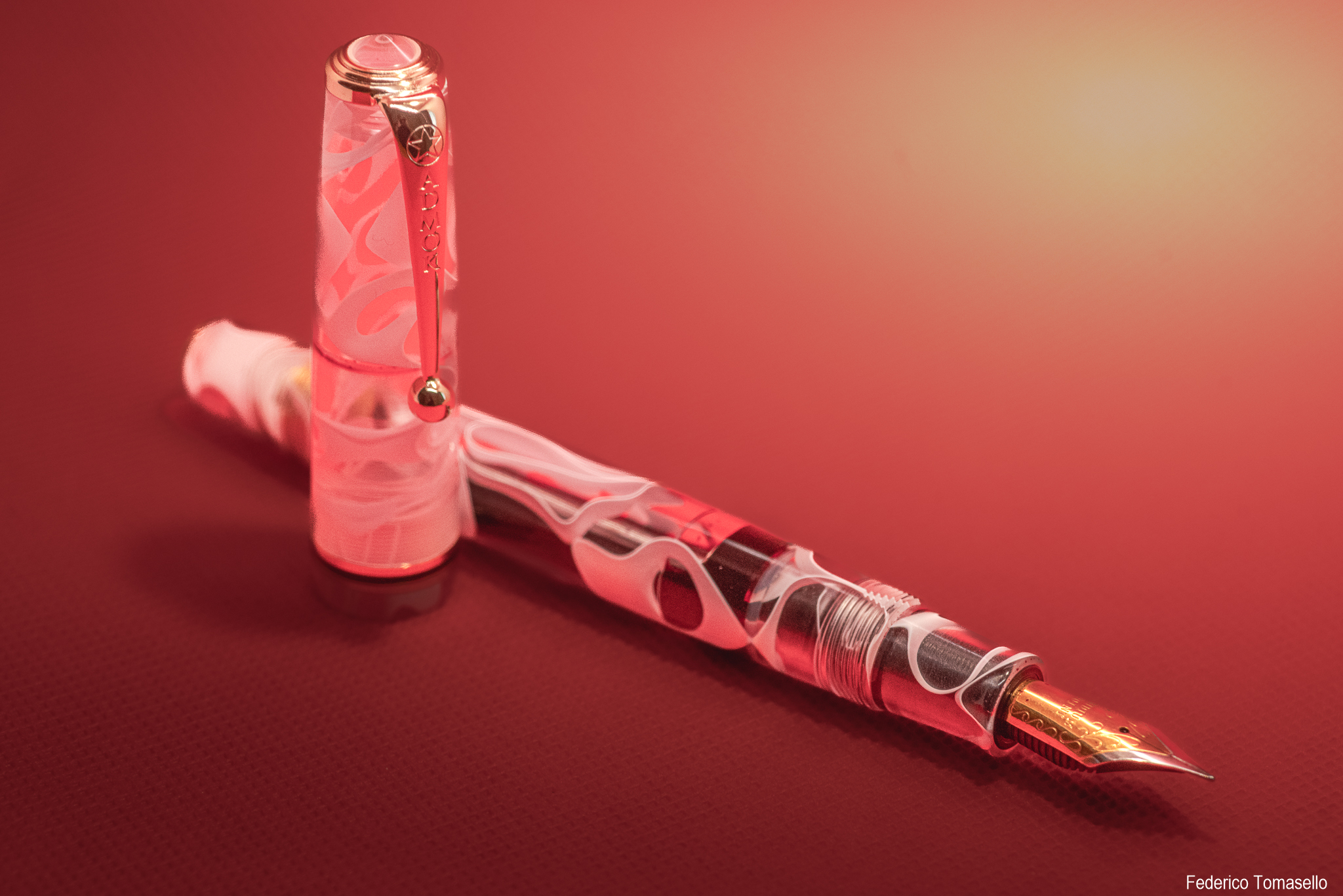 Dalle foto non si capisce molto perché il fondale rosso riflette ovunque, ma la penna è di acrilico trasparente, con una strana decorazione tortuosa bianco-rosata, molto affascinante agli occhi del sottoscritto, che se la rigira in mano per minuti prima di ricordarsi che deve scrivere qualcosa.