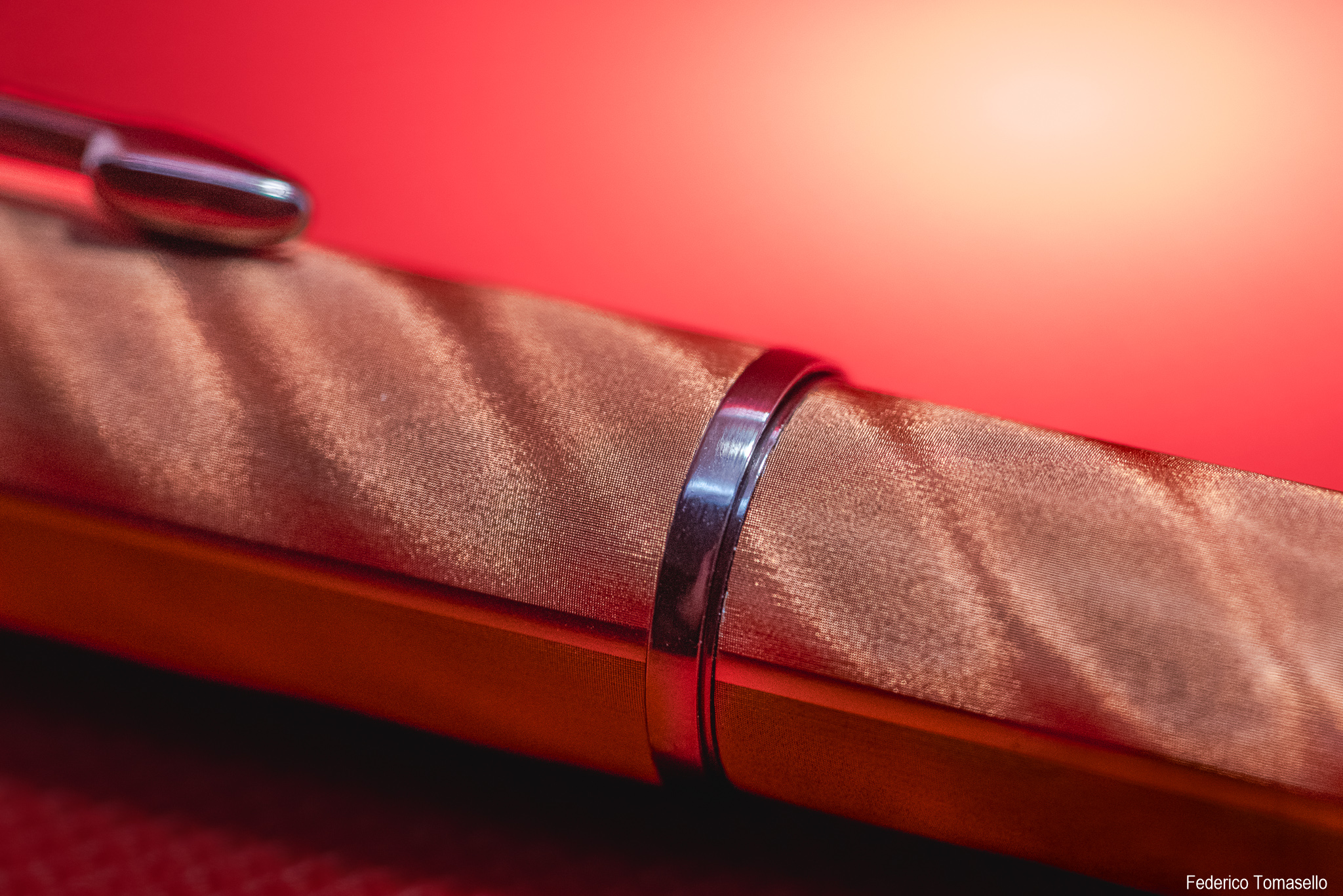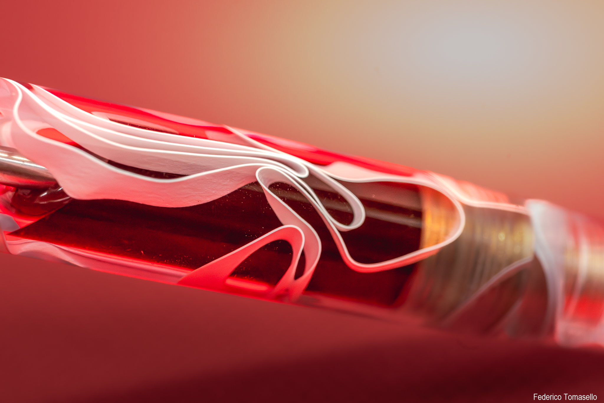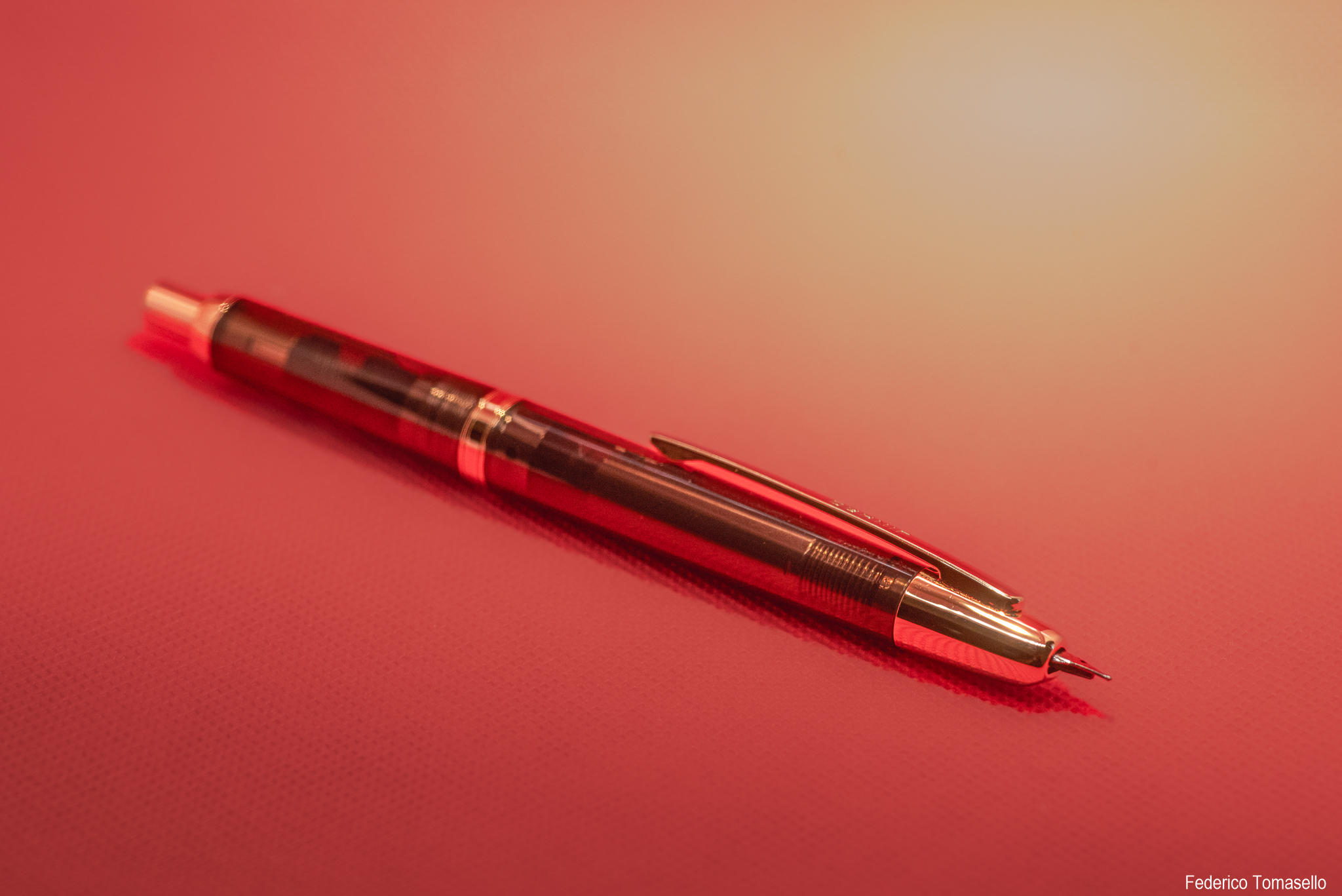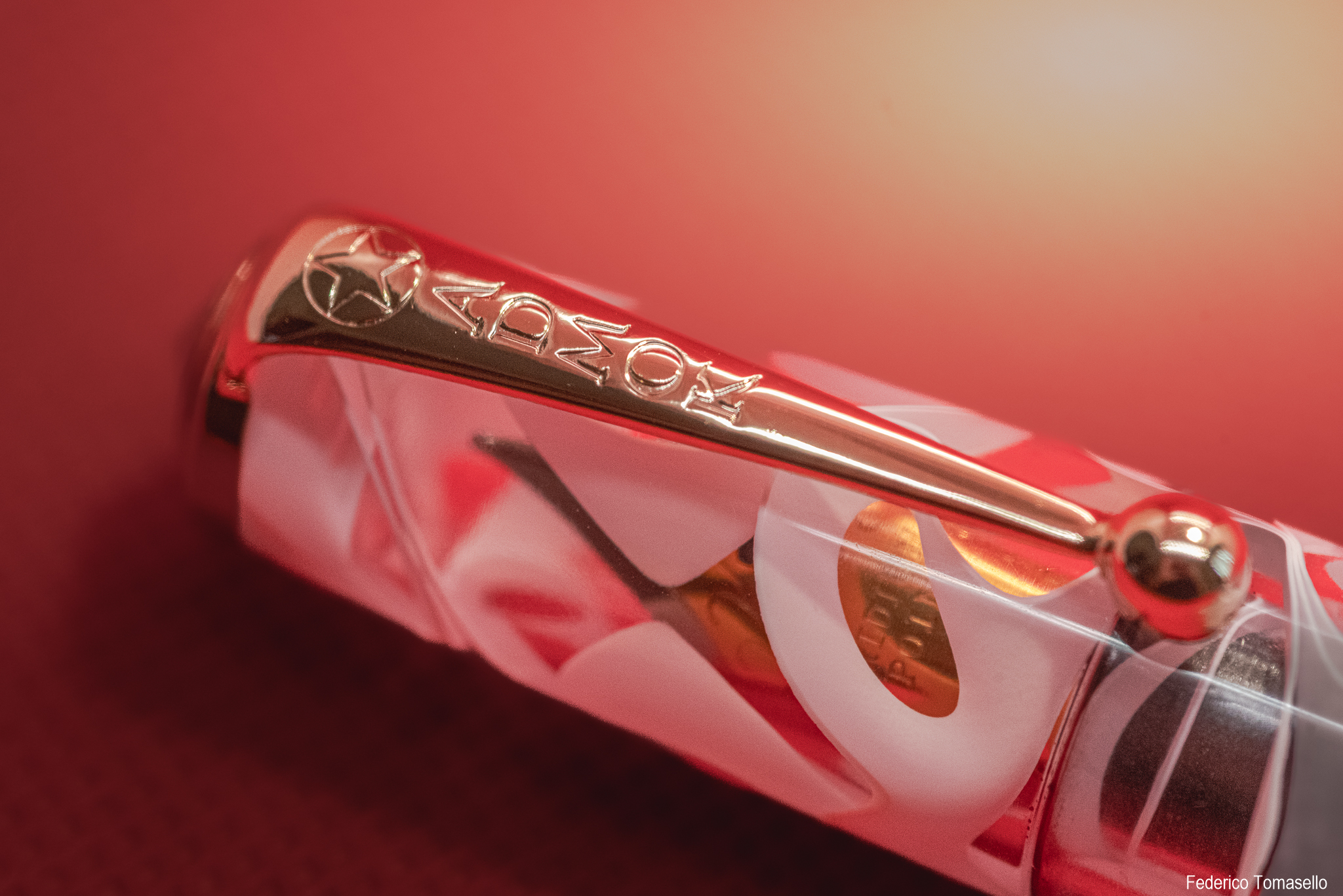 Dalle foto non si capisce molto perché il fondale rosso riflette ovunque, ma la penna è di acrilico trasparente, con una strana decorazione tortuosa bianco-rosata, molto affascinante agli occhi del sottoscritto, che se la rigira in mano per minuti prima di ricordarsi che deve scrivere qualcosa.