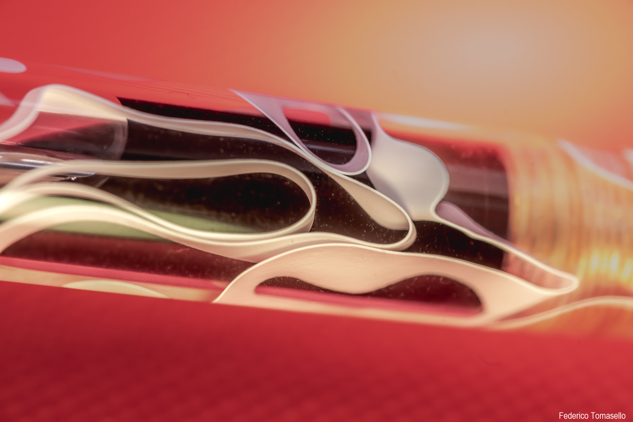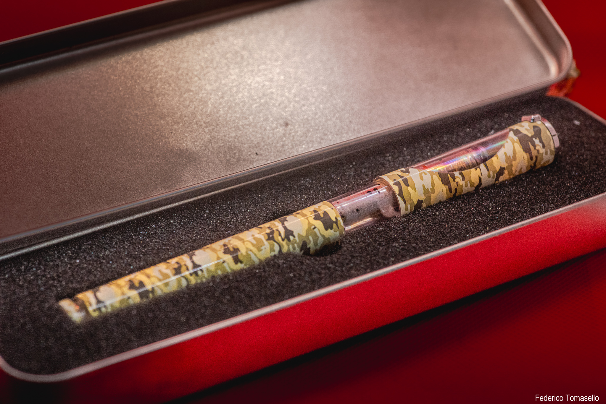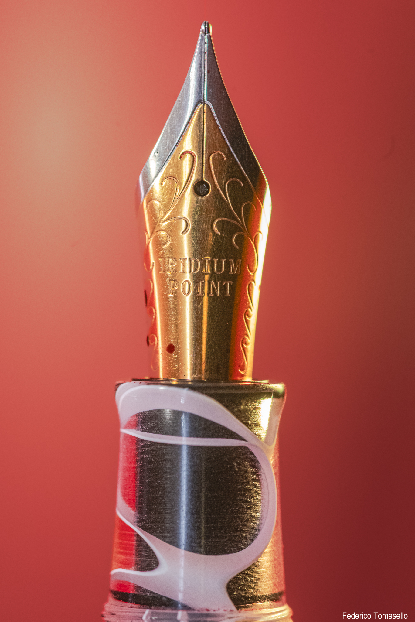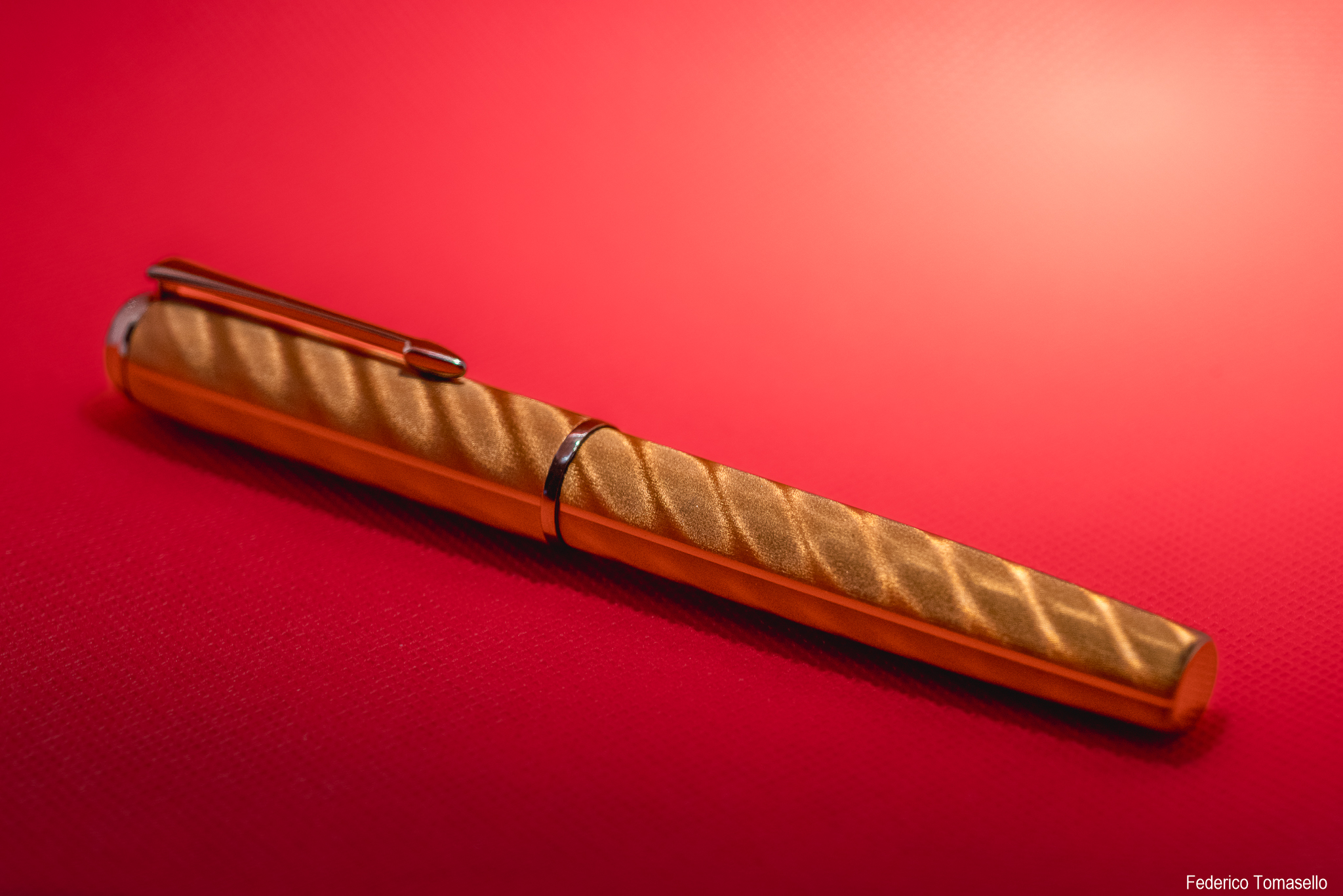 Dalle foto non si capisce molto perché il fondale rosso riflette ovunque, ma la penna è di acrilico trasparente, con una strana decorazione tortuosa bianco-rosata, molto affascinante agli occhi del sottoscritto, che se la rigira in mano per minuti prima di ricordarsi che deve scrivere qualcosa.