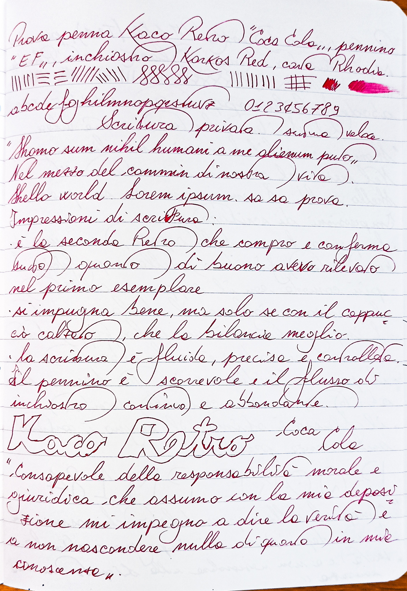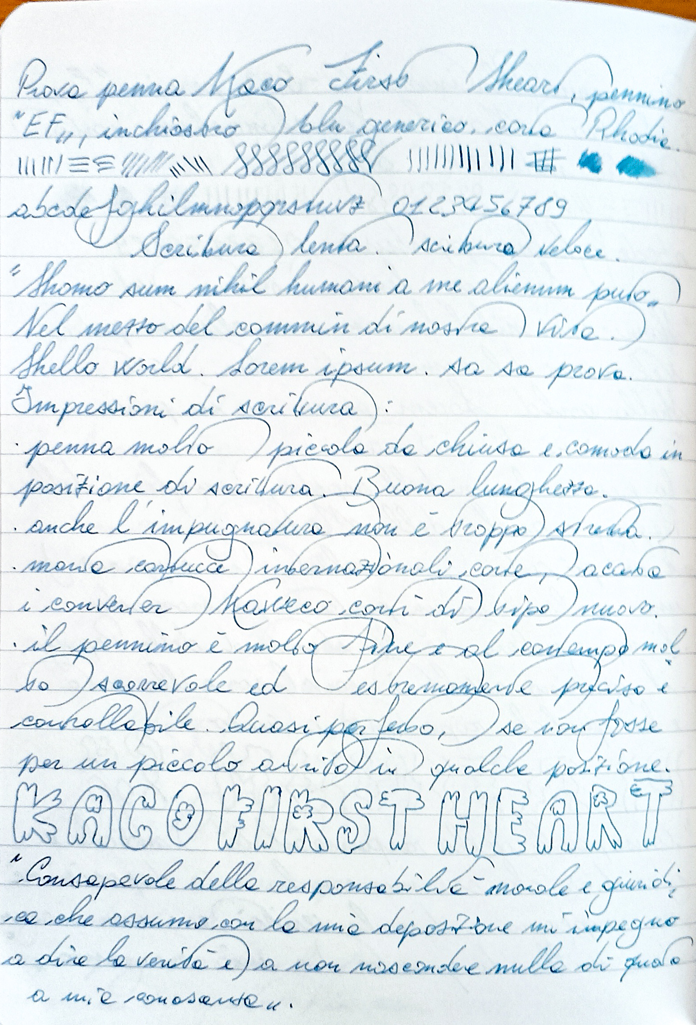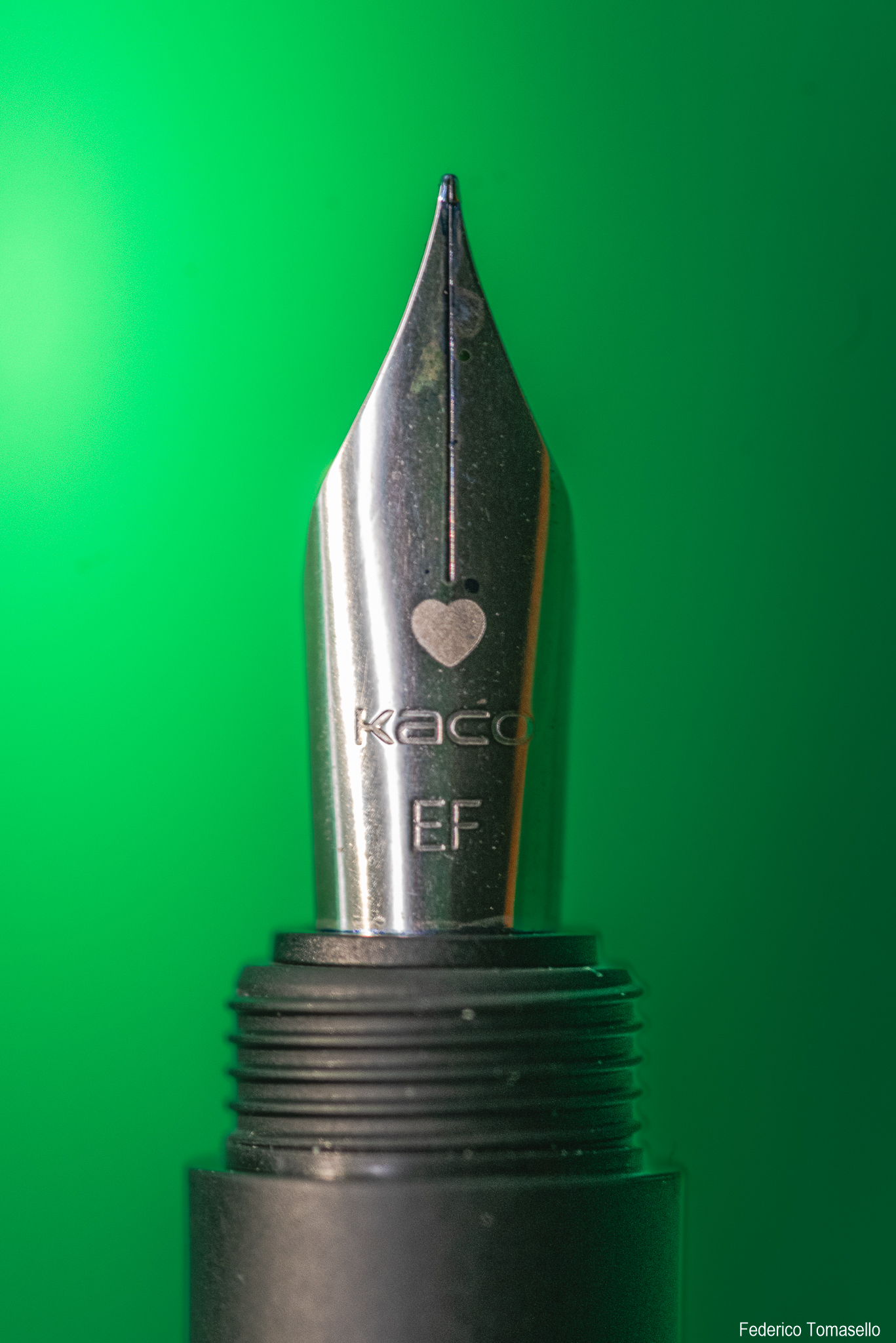 Il pennino, che dovrebbe essere uno Schmidt come in tutte le altre Kaco, scrive benissimo ed è un extrafine abbastanza veritiero, così come gli EF della Mellow o della Sky.