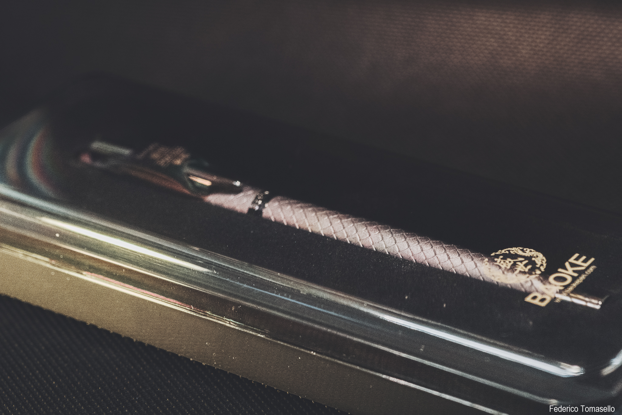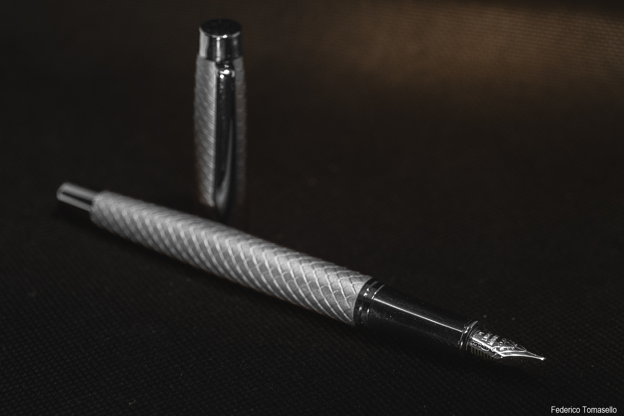 Si presenta bene nella sua scatoletta e con il suo fusto metallico dalla finitura piacevolmente lavorata. Ammetto però di essere rimasto un po' deluso dall'aver trovato montato un semplice pennino "Iridium Point"; non tanto per la qualità dello stesso, molto più che accettabile, ma per il fatto che l'altro modello aveva quantomeno un pennino marchiato. Vabbè, poca cosa.