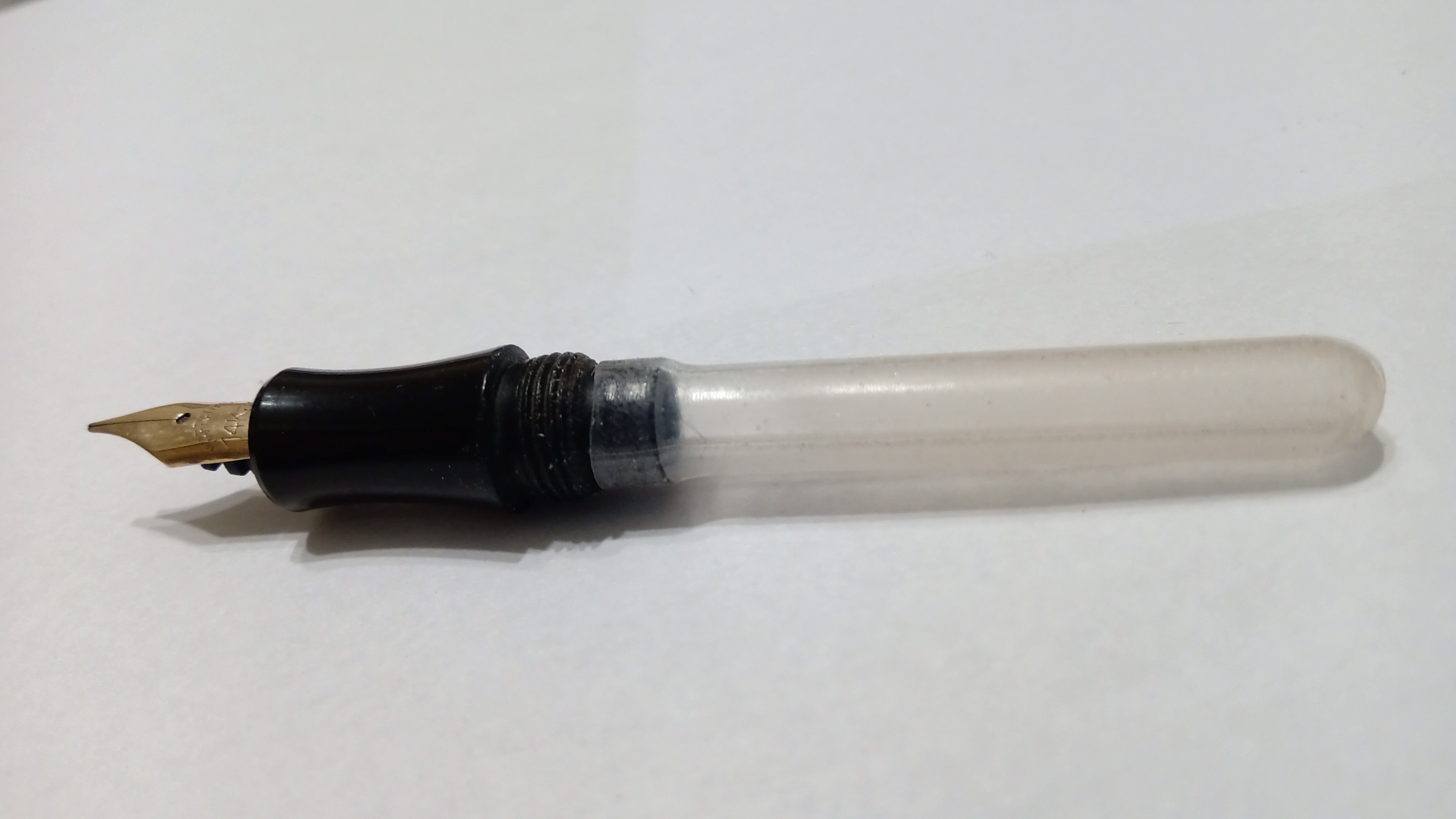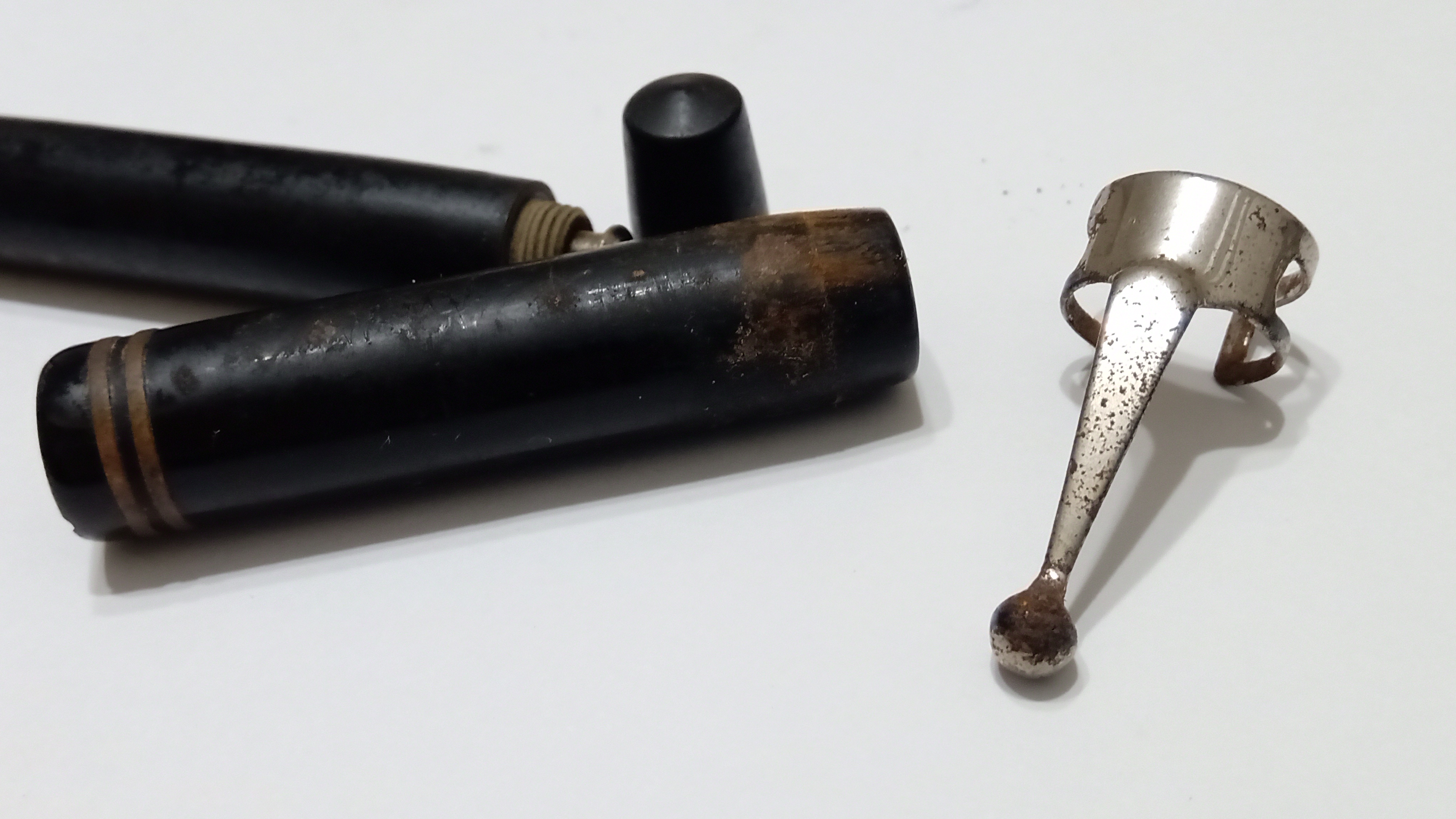 y tanto el plumín como el alimentador tenían tinta seca que formaba una sólida costra en ambas piezas...