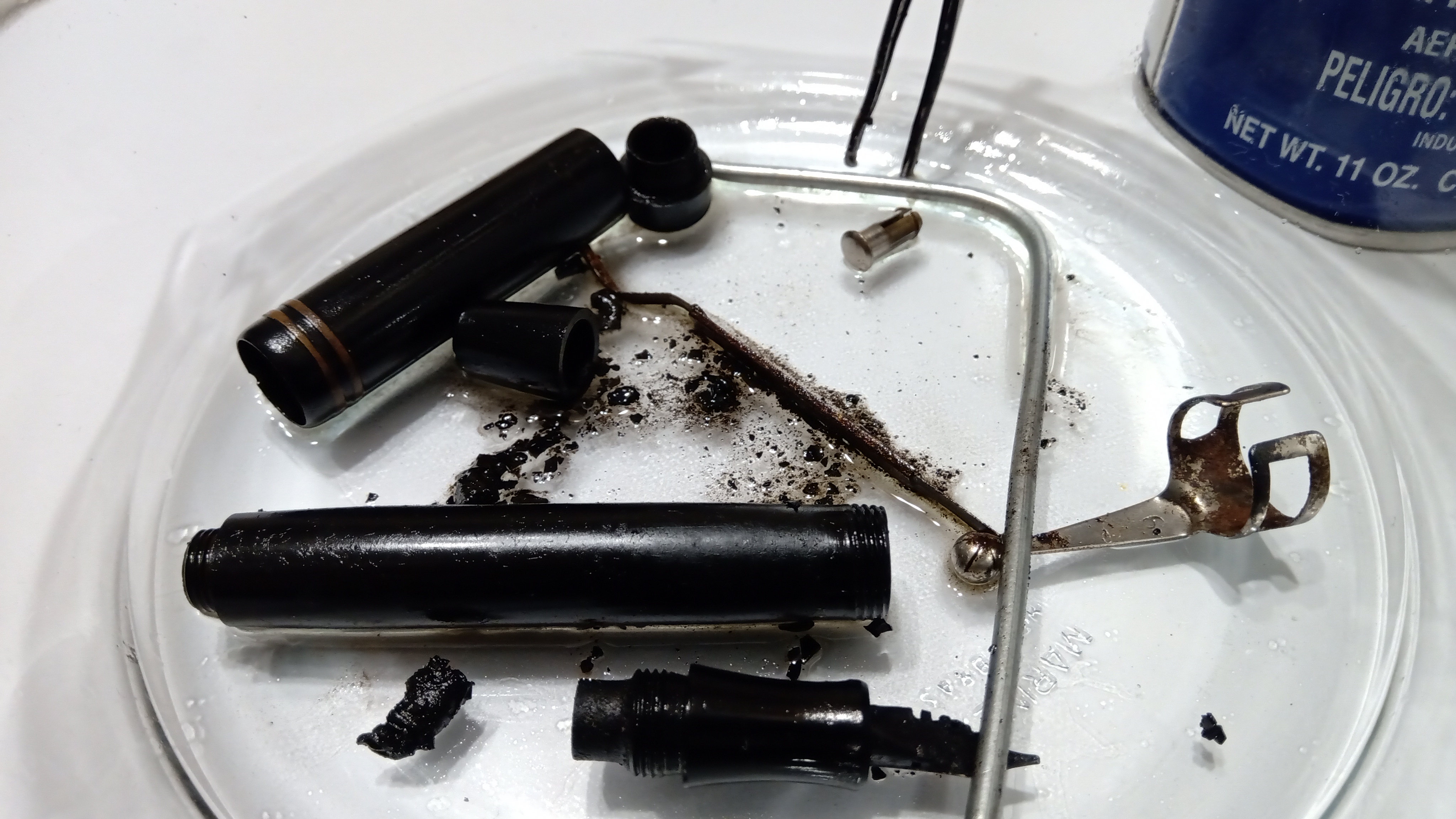 Llegamos así a tener todas las partes ya secas y relativamente limpias, listas para comenzar a trabajar. Barril, grip, capuchón, clip, tapa ciega del pulsante, tapa del capuchón, alimentador, plumín, pulsante y fleje...