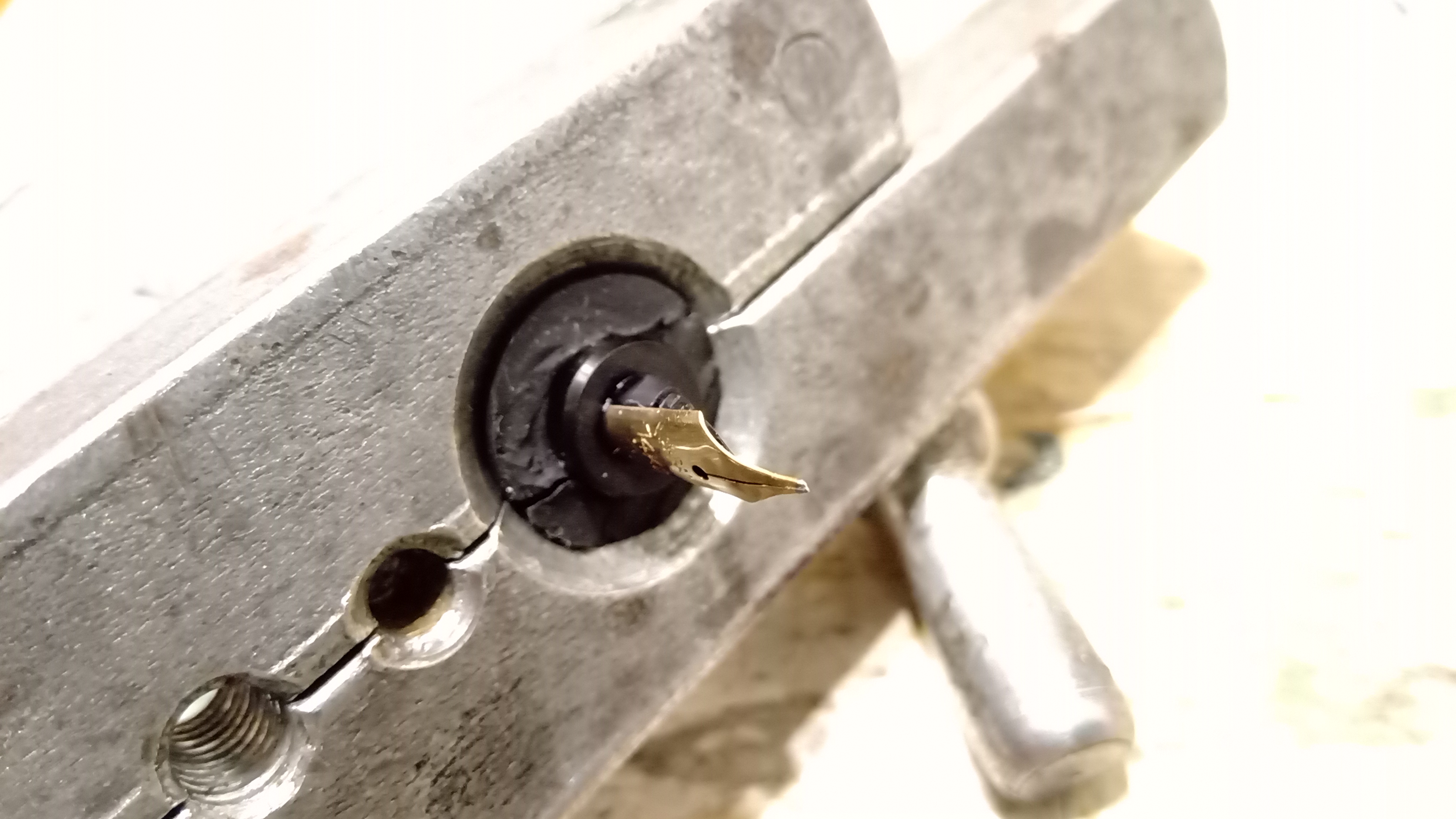 Asegurando luego el grip en una pequeña morsa con asiento cilíndrico y caucho duro, empujamos desde la parte posterior con una barrita de acero el alimentador junto con el plumín, dando unos golpecitos suaves...