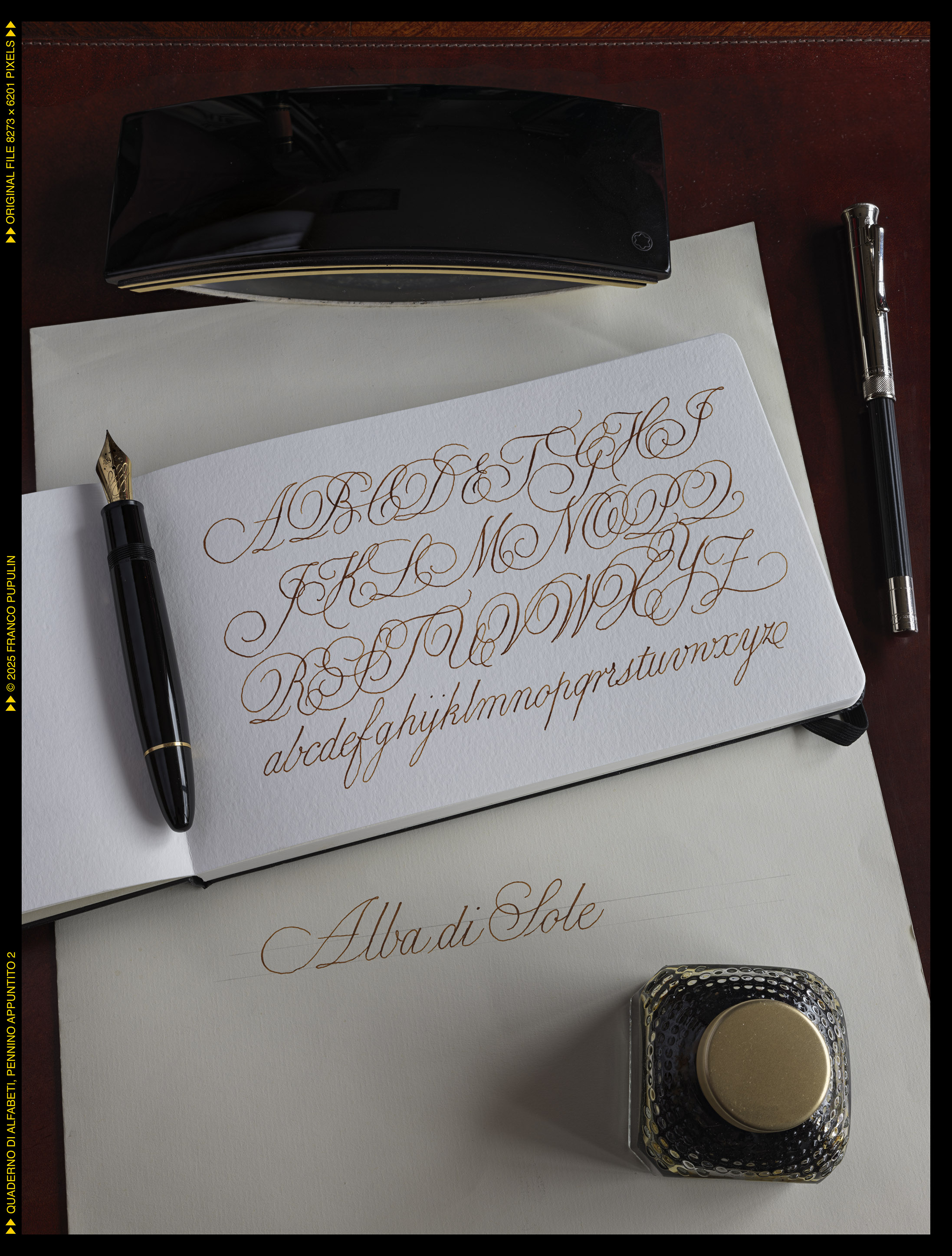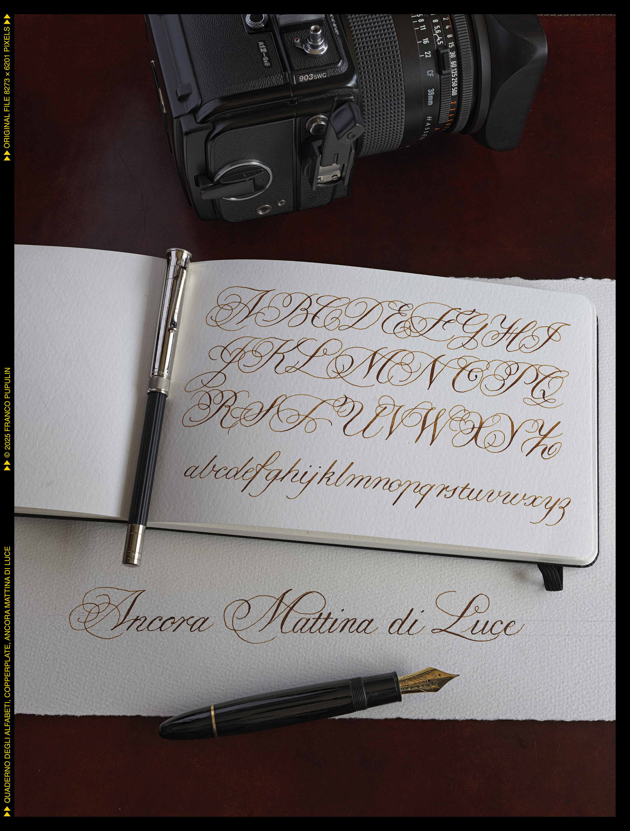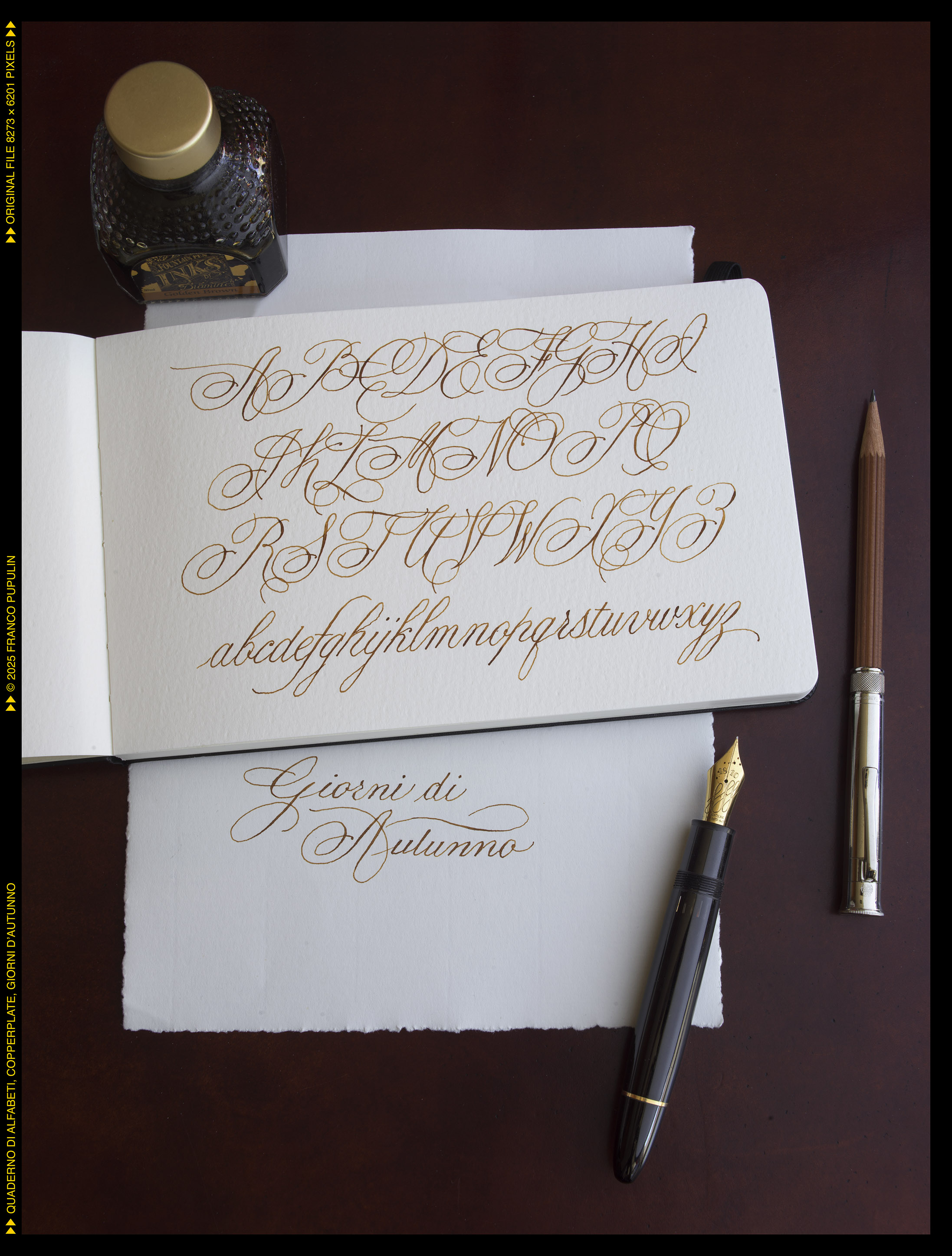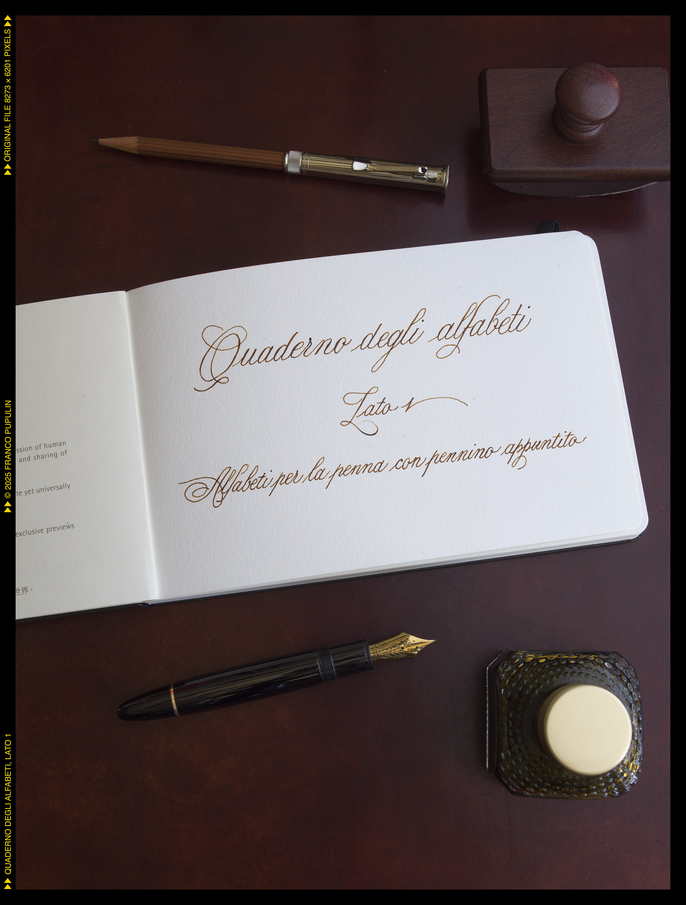 Questa é la prima pagina del dritto del quaderno, dove appunteró gli alfabeti che si eseguono con il pennino appuntito, flessibile o meno: il Copperplate (o meglio, le tante variazioni del Copperplate), lo Spenceriano (con variazioni), il Palmer, e molti alfabeti più moderni, compresi vari gestuali contemporanei.