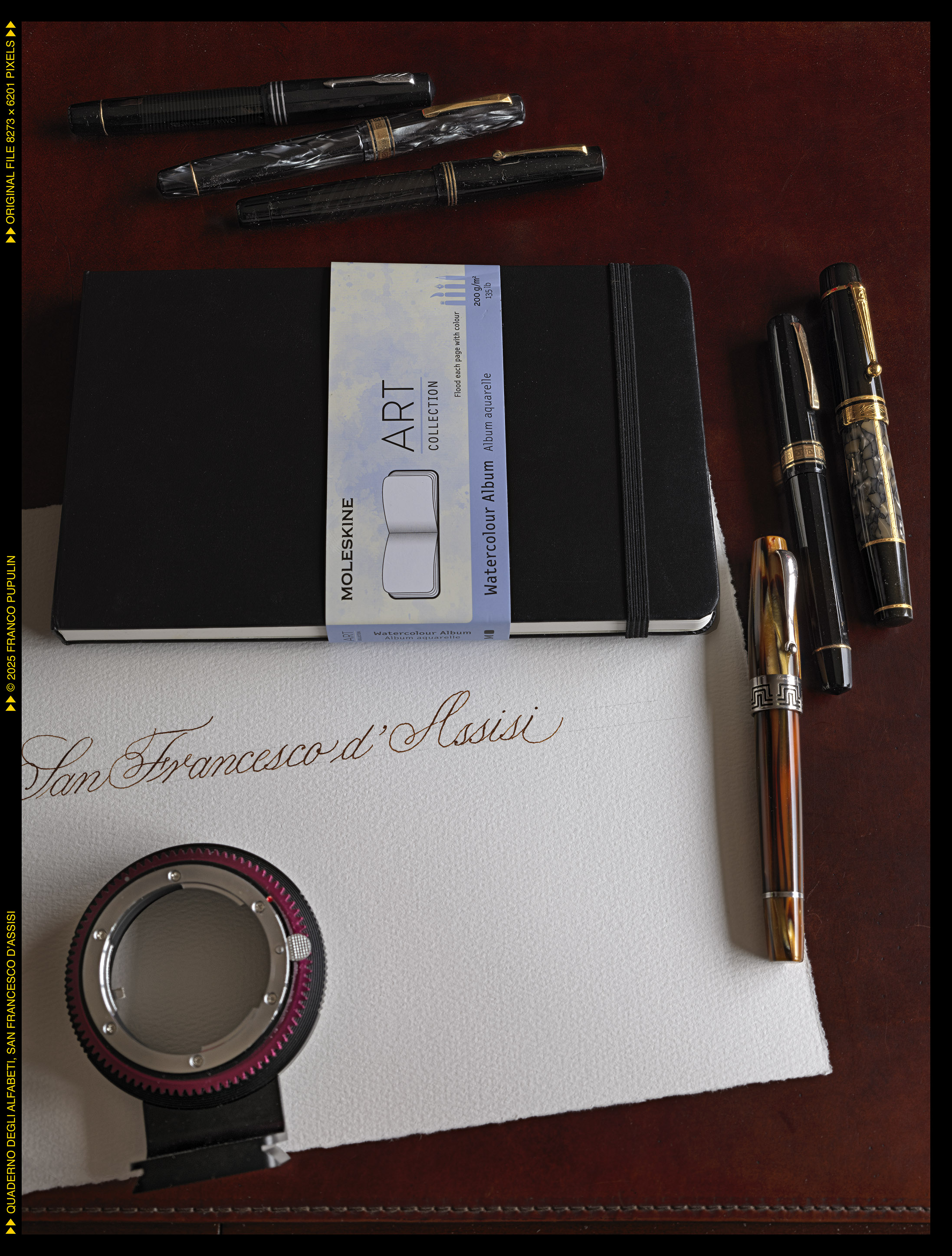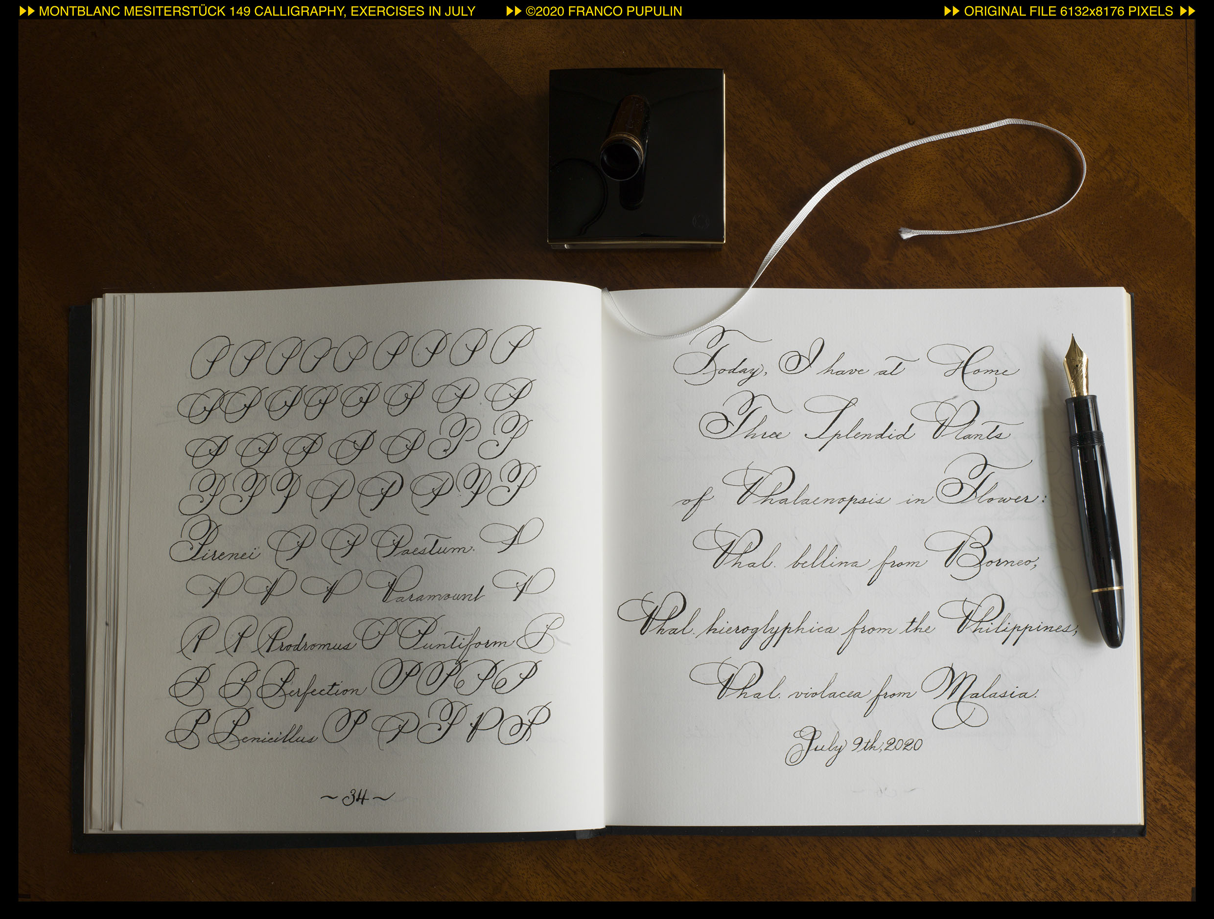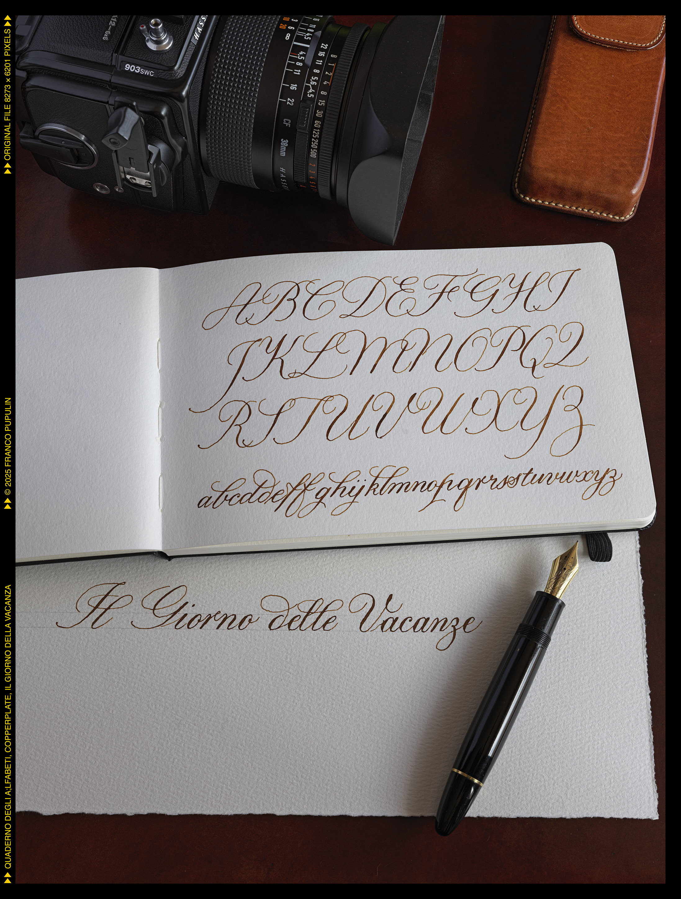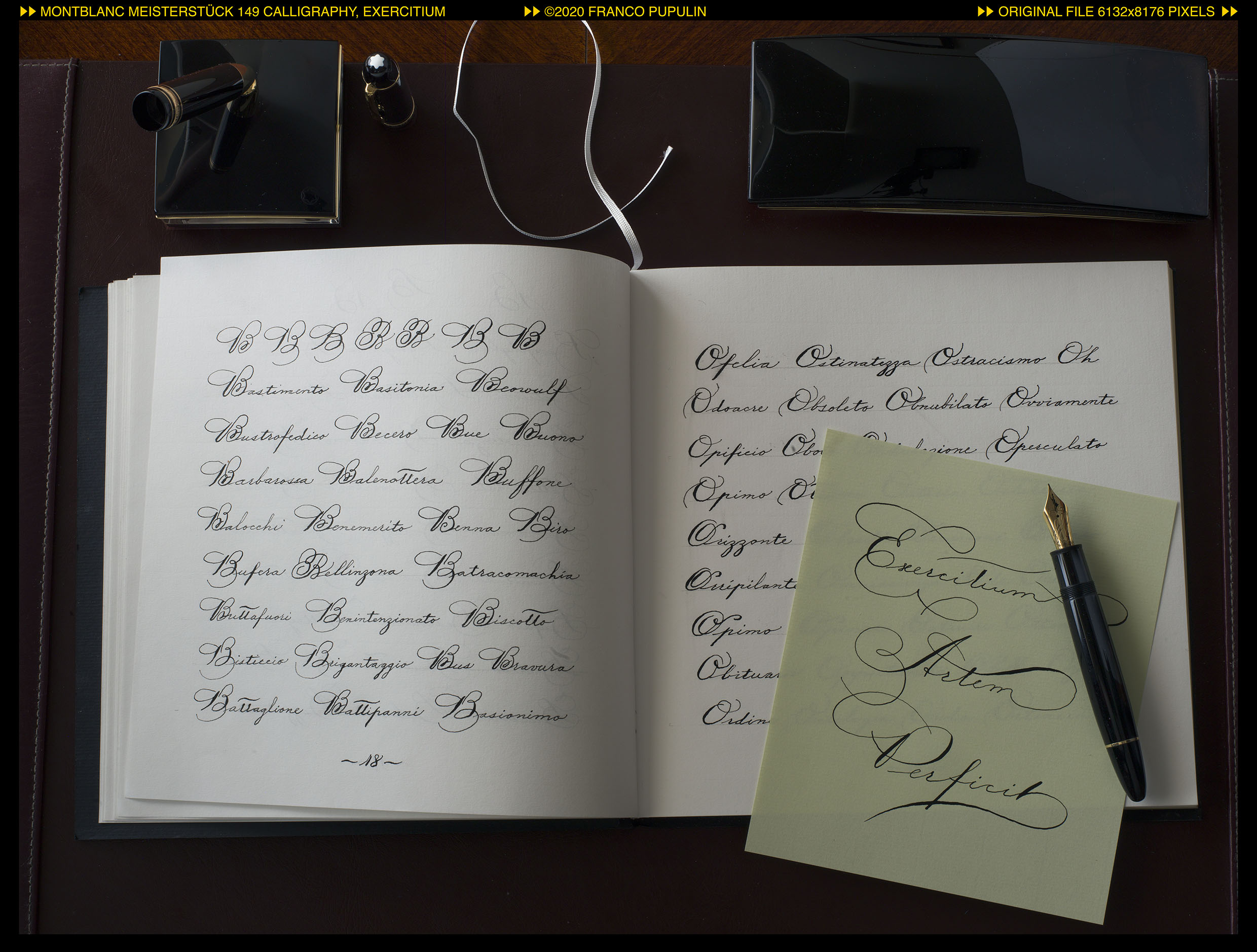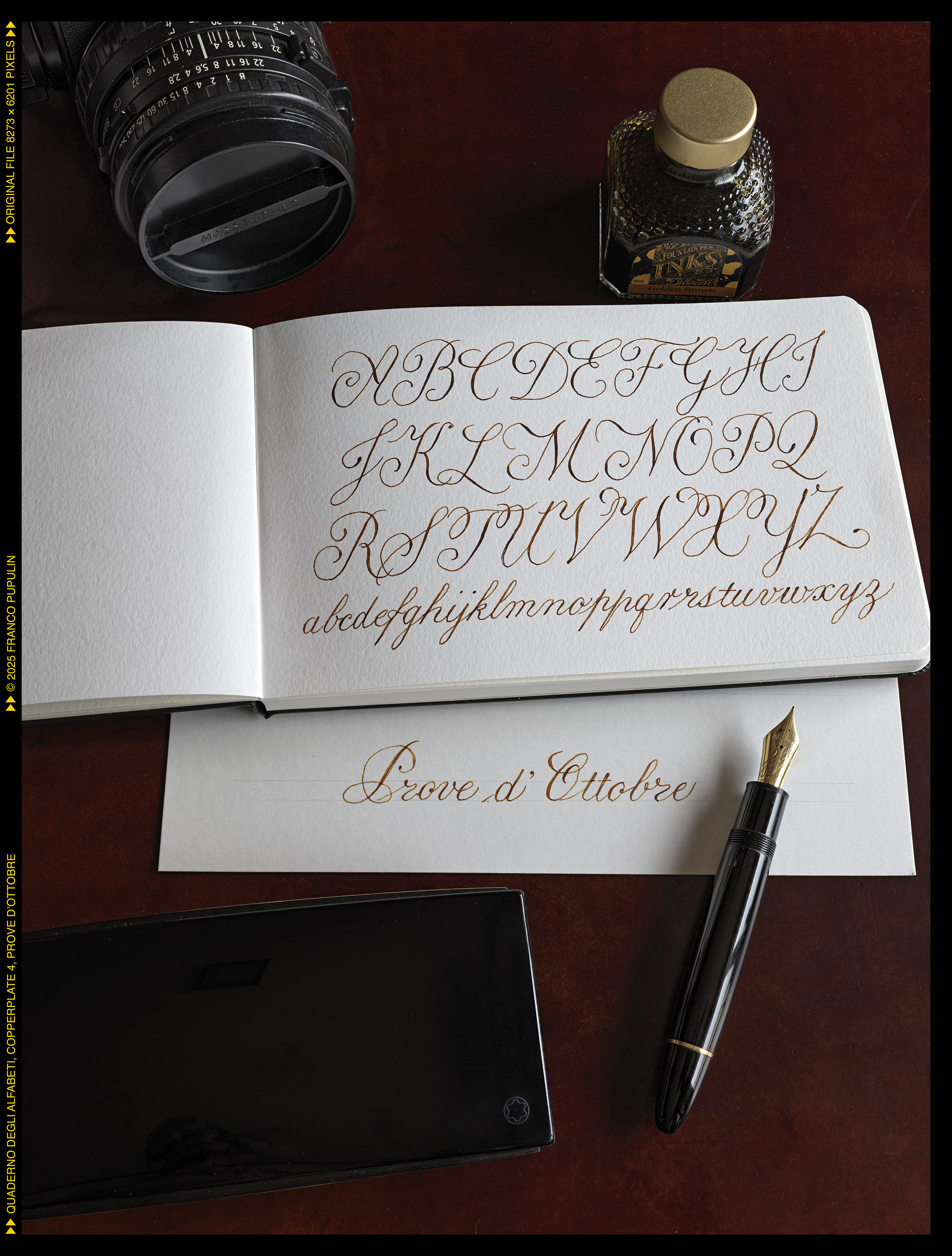 Questa é la prima pagina del dritto del quaderno, dove appunteró gli alfabeti che si eseguono con il pennino appuntito, flessibile o meno: il Copperplate (o meglio, le tante variazioni del Copperplate), lo Spenceriano (con variazioni), il Palmer, e molti alfabeti più moderni, compresi vari gestuali contemporanei.