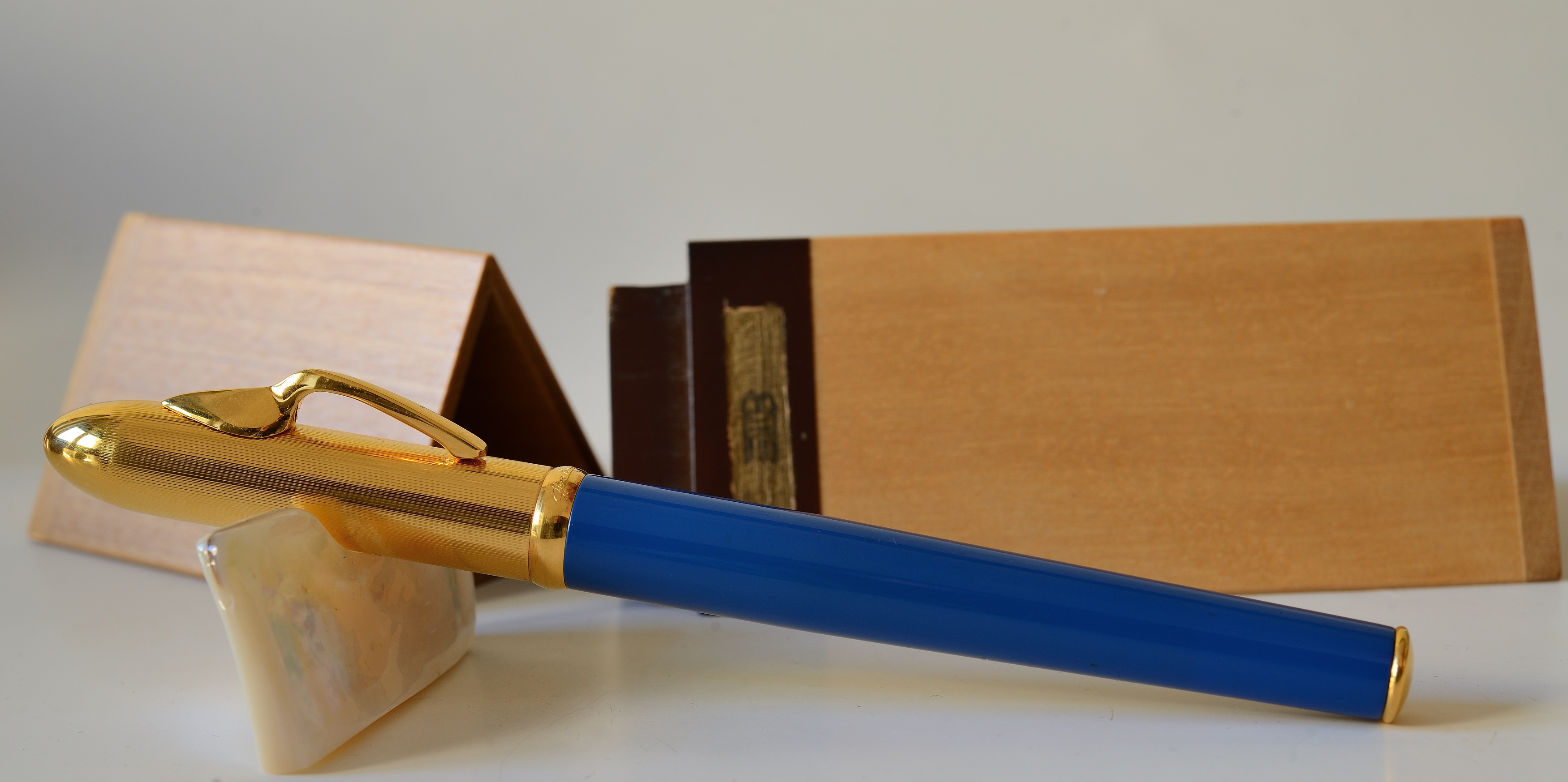Questa volta dovrebbe trattarsi di una stilografica Ettore Bugatti Type 50. Dalle poche informazioni reperite in rete, dovrebbe essere stata prodotta, credo negli anni 90, dalla Montegrappa, in esclusiva per le boutique Bugatti (mai vista una). Ha fusto in ottone laccato blu, cappuccio dorato, la clip ha la forma dell’automobile Bugatti T 50 (da cui il nome), alcuni, invece, la fanno risalire alla Bugatti T 57 Atlantic. La giunzione fusto-sezione realizzata metallo su metallo, assicura ottima stabilità. Sezione argentata con fossette, a riprendere il motivo della tappezzeria classica Bugatti. Il pennino, tra F ed M, è bicolore, in oro18K, alimentatore credo in ebanite. Caricamento cartuccia/converter di tipo Pelikan. Come al solito NOS, mai inchiostrata, completa della sua scatolina prismatica in legno.