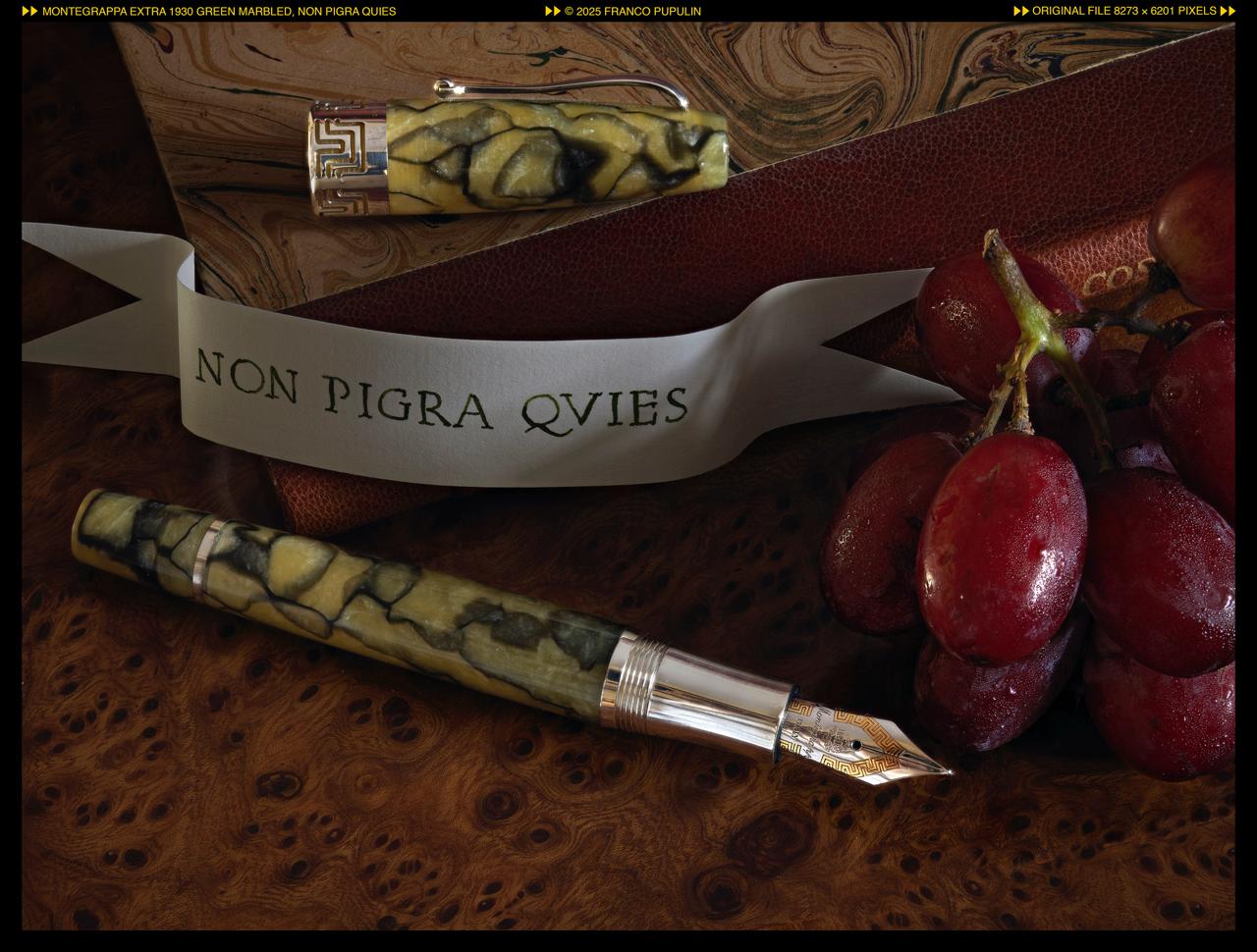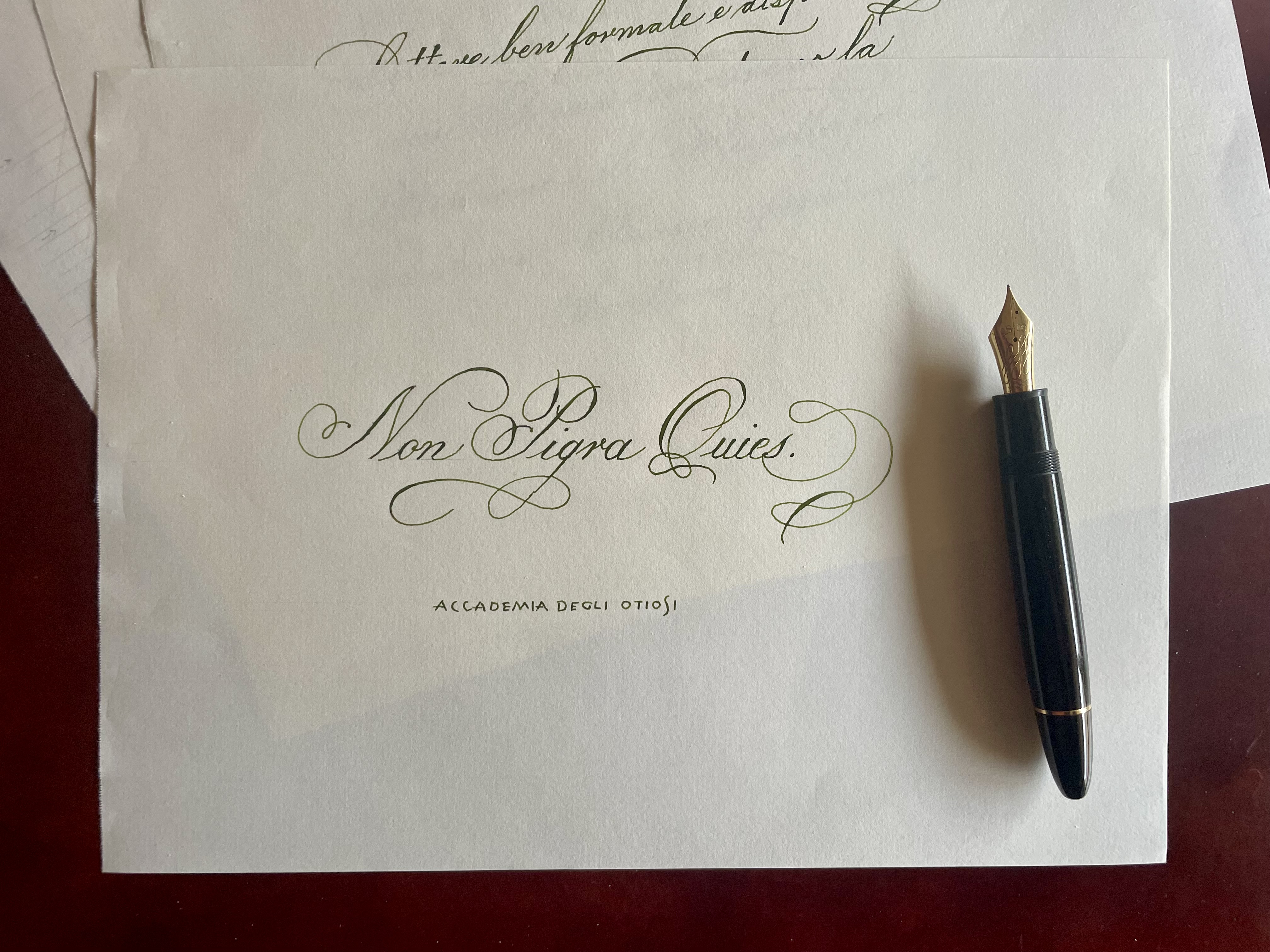 Ho voluto immortalare questa non pigra quies in un cartiglio, accanto a uno dei miei lavori botanici e alla Montegrappa Extra 1930 in Verde marmorizzato, una penna che a sua volta mi trasmette l’impressione di una bellezza quieta e operosa.