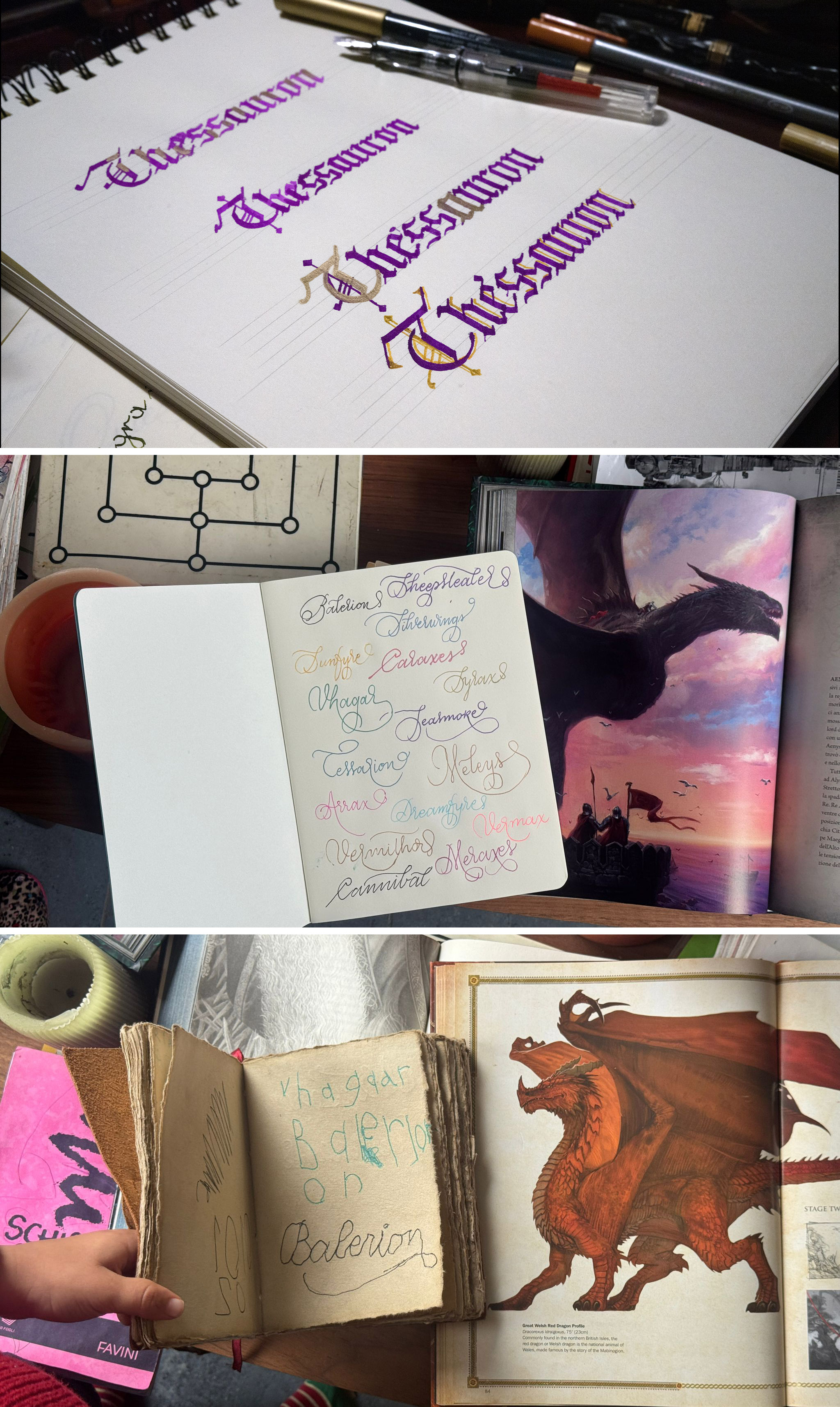 Dico a mio nipote di venire e sedersi di fronte al computer, dove il suo nonno scriverà anche lui il nome di un drago, Thessauron. Lui guarda incantato il colore dell'inchiostro come prende forma sul foglio. Allora anche lui vuole scrivere il nome di un drago, con un "volazzo": Balerion.
