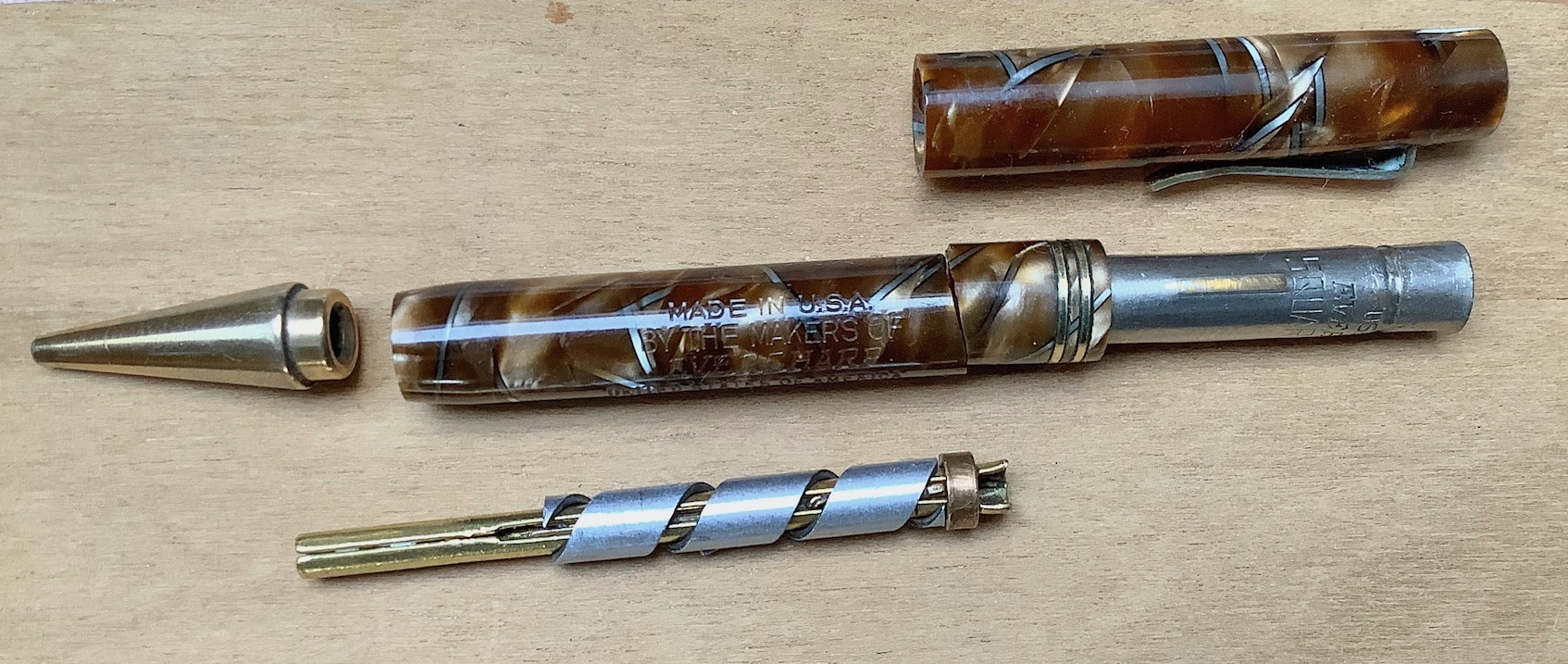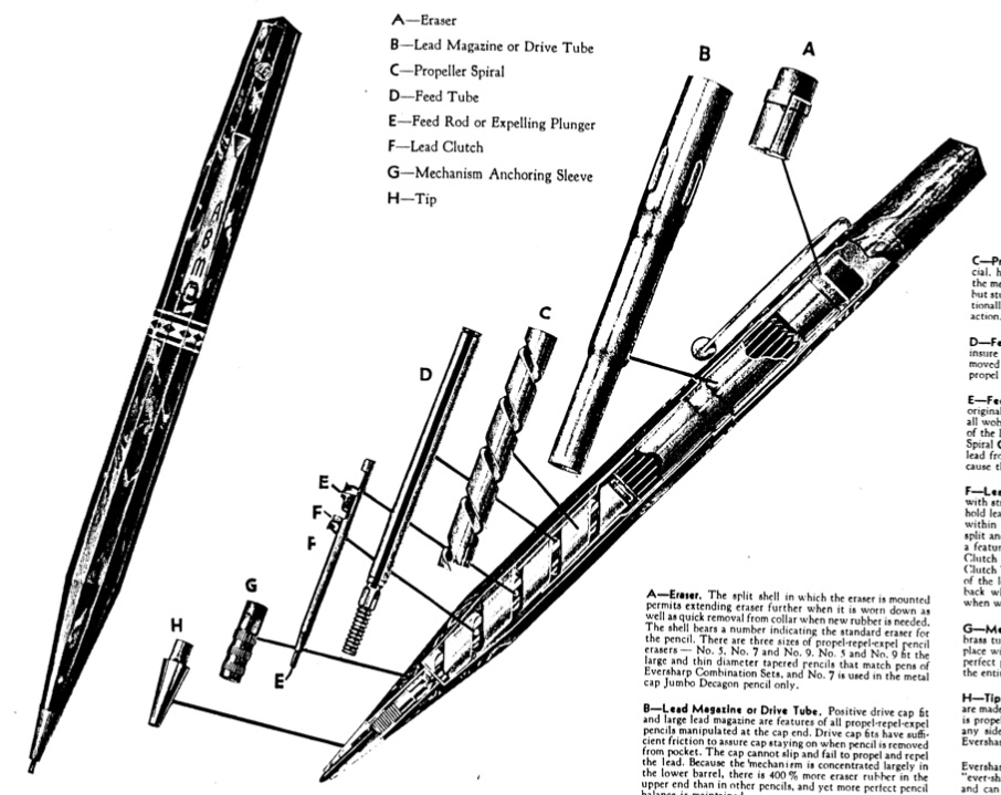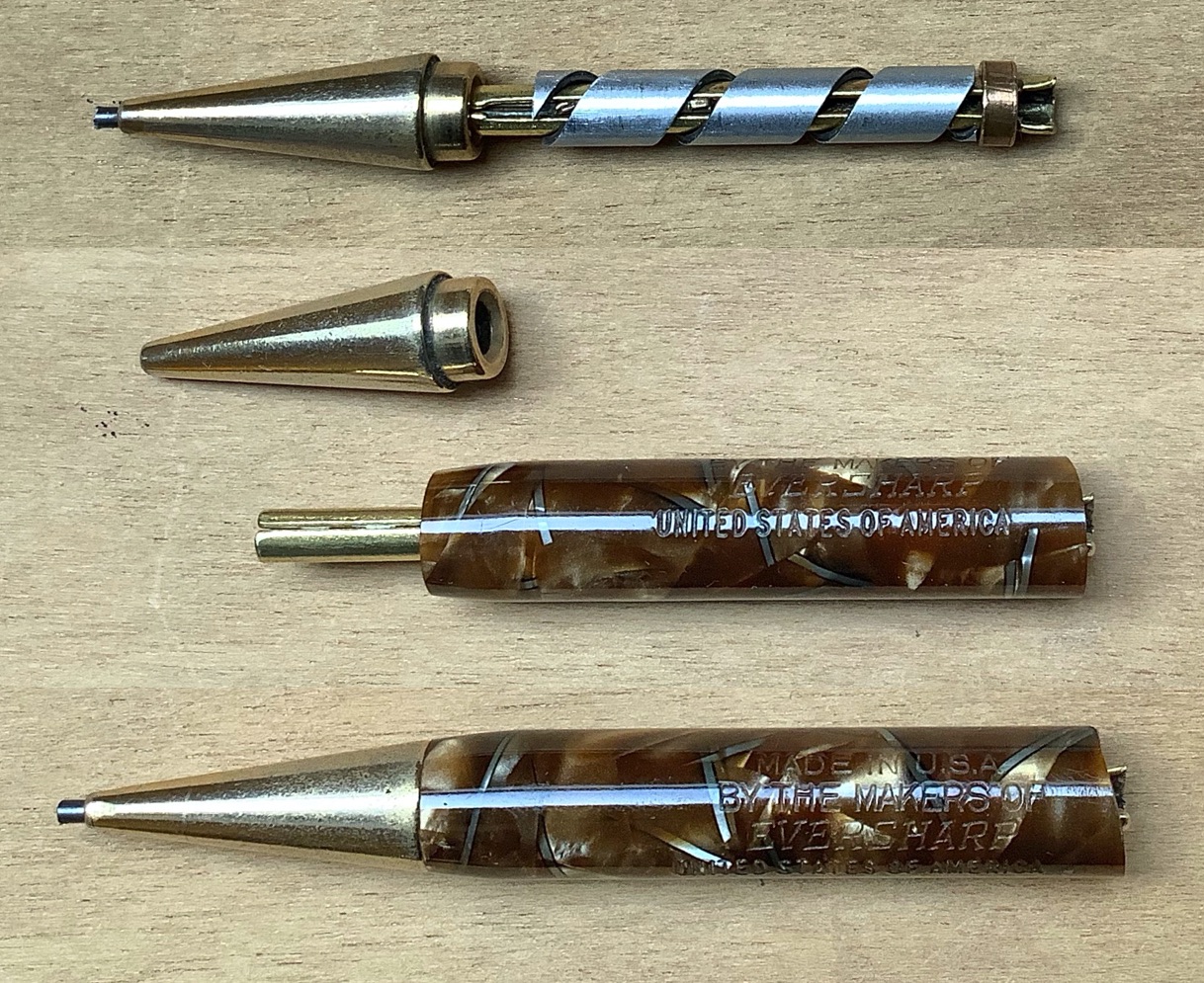 Tengo a precisare che seppure il meccanismo è fondamentalmente lo stesso per molte matite di Eversharp del tempo, alcuni particolari presentano comunque delle variazioni di cui è bene tener presente (a esempio sulle matite Doric il puntale è avvitato al fusto).