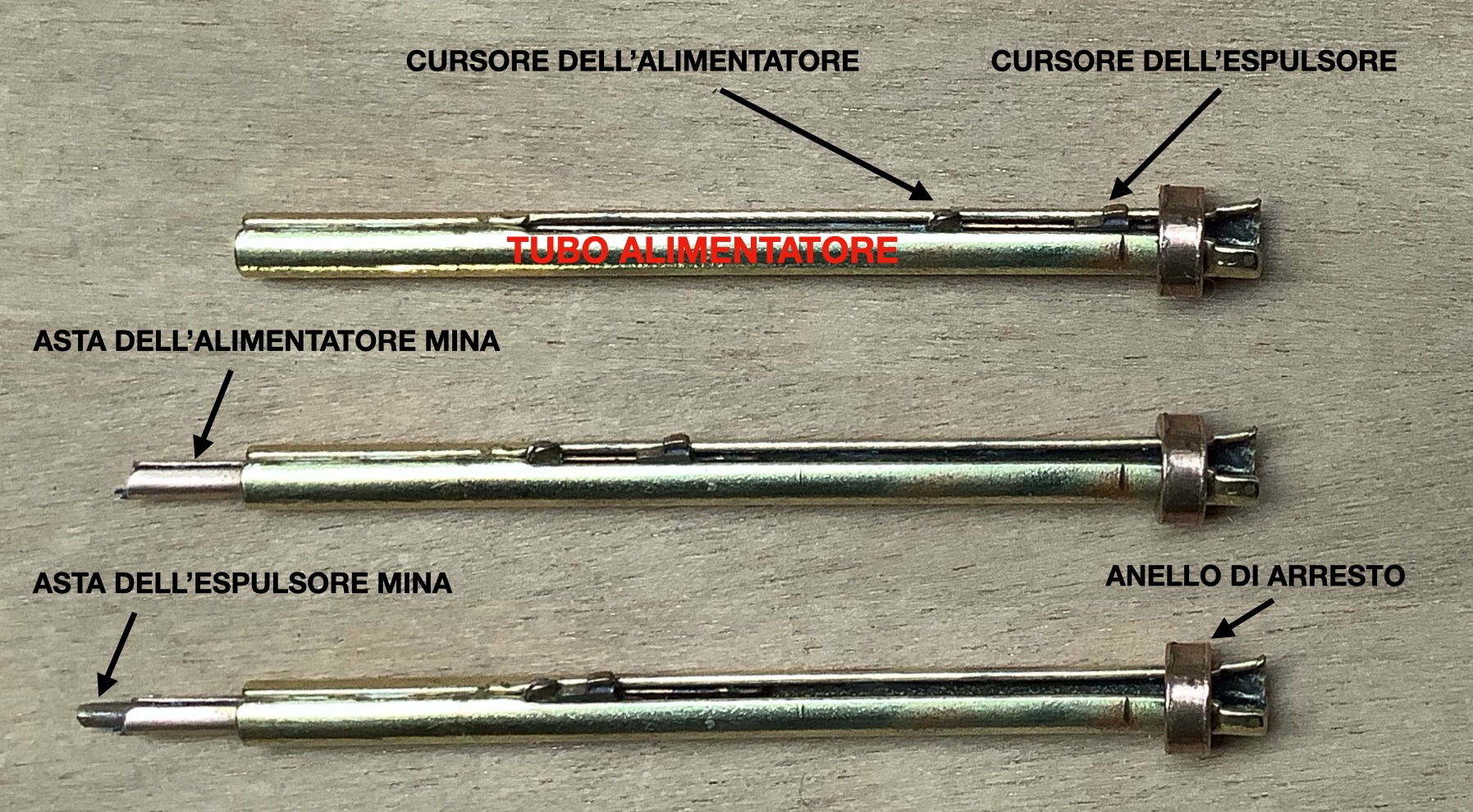 L’asta più interna, governata dal cursore dell'espulsore ,è l’asta dell’espulsore della mina. Essa scorre all’interno dell’asta dell’alimentatore che tiene bloccata un’estremità della mina.