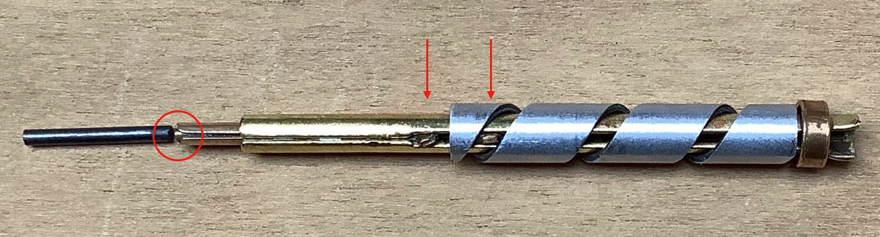 Proseguendo a ruotare il puntale, e dopo che la mina verrà completamente esposta per tutta la sua lunghezza, giungerà il finecorsa del cursore di espulsione e della relativa asta dell'espulsore, con il conseguente sfilamento della mina stessa dal suo alloggiamento nell’asta di alimentazione. (la freccia rossa di destra indica la posizione del cursore di espulsione, la freccia sinistra indica il cursore di alimentazione, nel cerchio si intravede l'asta dell'espulsore che fuoriesce dall'asta di alimentazione).