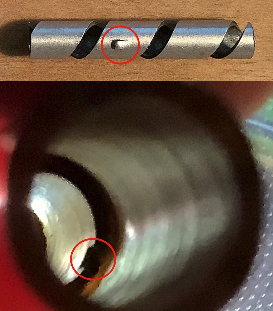 La protuberanza va a incastrasti in una risega ricavata all'interno del fusto, impedendo così ogni movimento di rotazione. Protuberanza e risega sono evidenziati dai cerchietti in rosso.