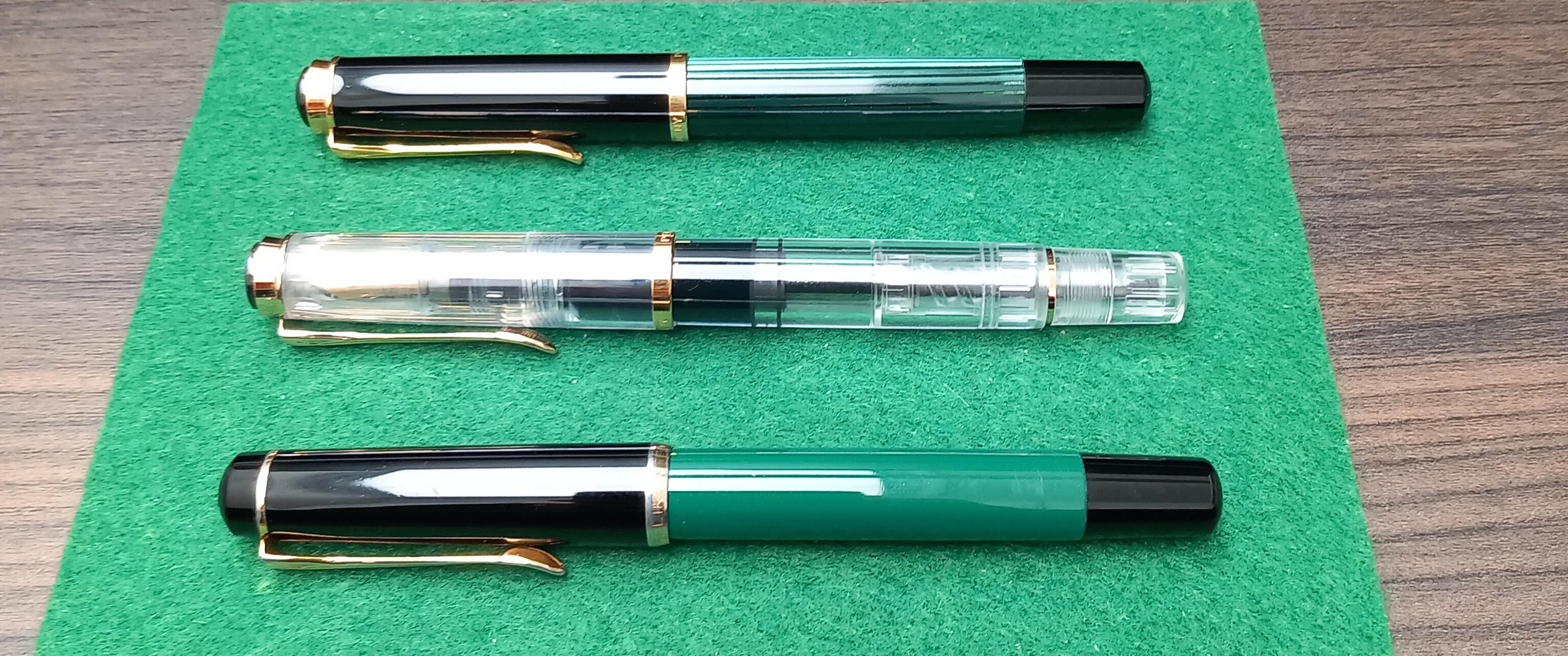 ad una M300 nera e ad una M600 originali degli anni '90 caricate rispettivamente di rosso e verde Pelikan.